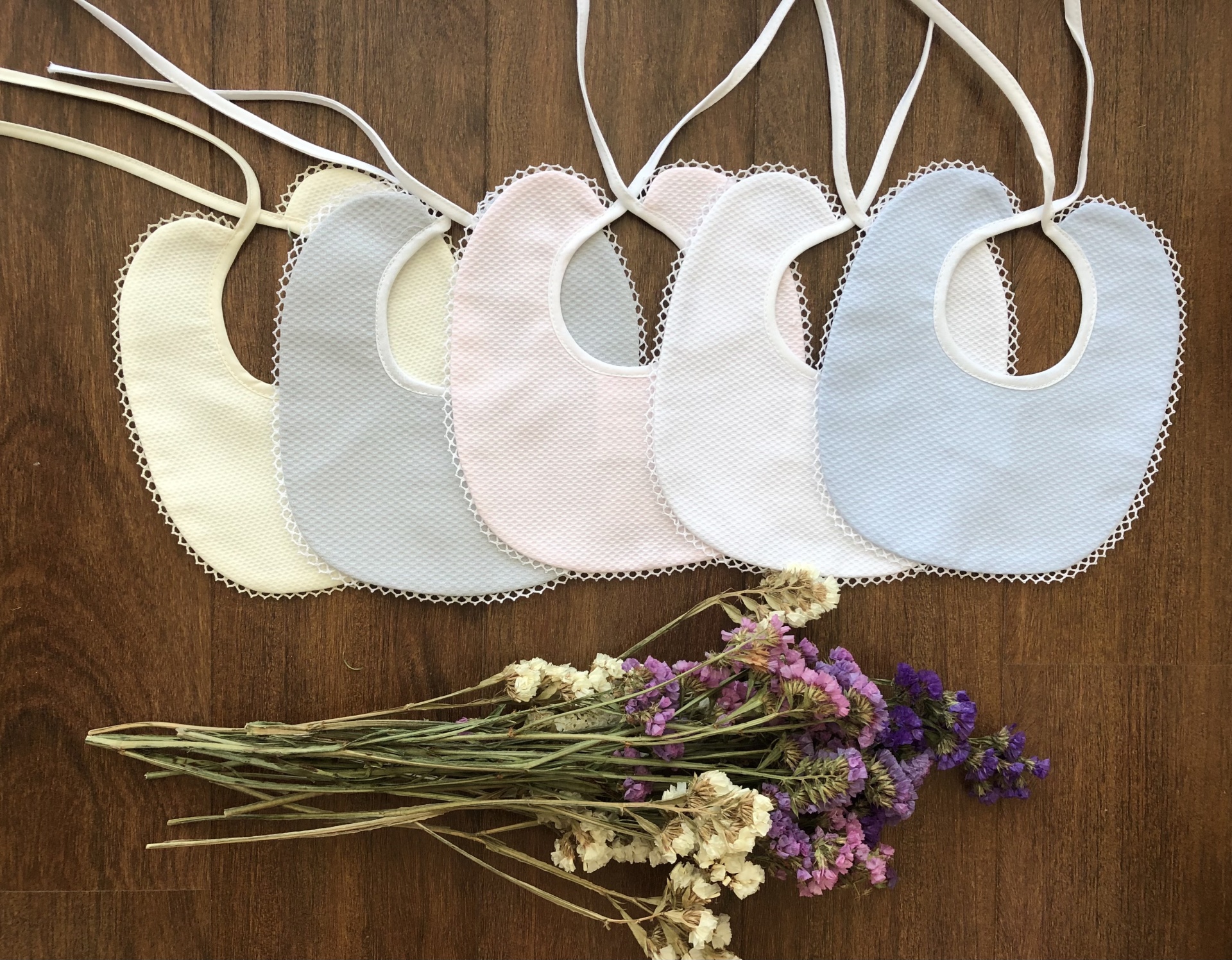 • Cinco babetes de bebé em cores pastel com flores secas sobre mesa de madeira