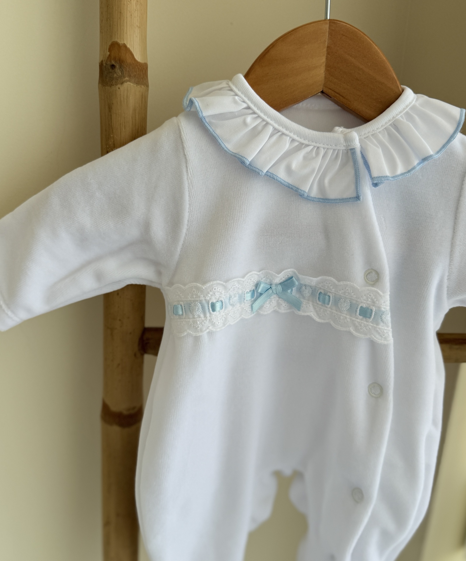 • Macacão de bebé branco com gola franzida e detalhes azuis pendurado num cabide de madeira