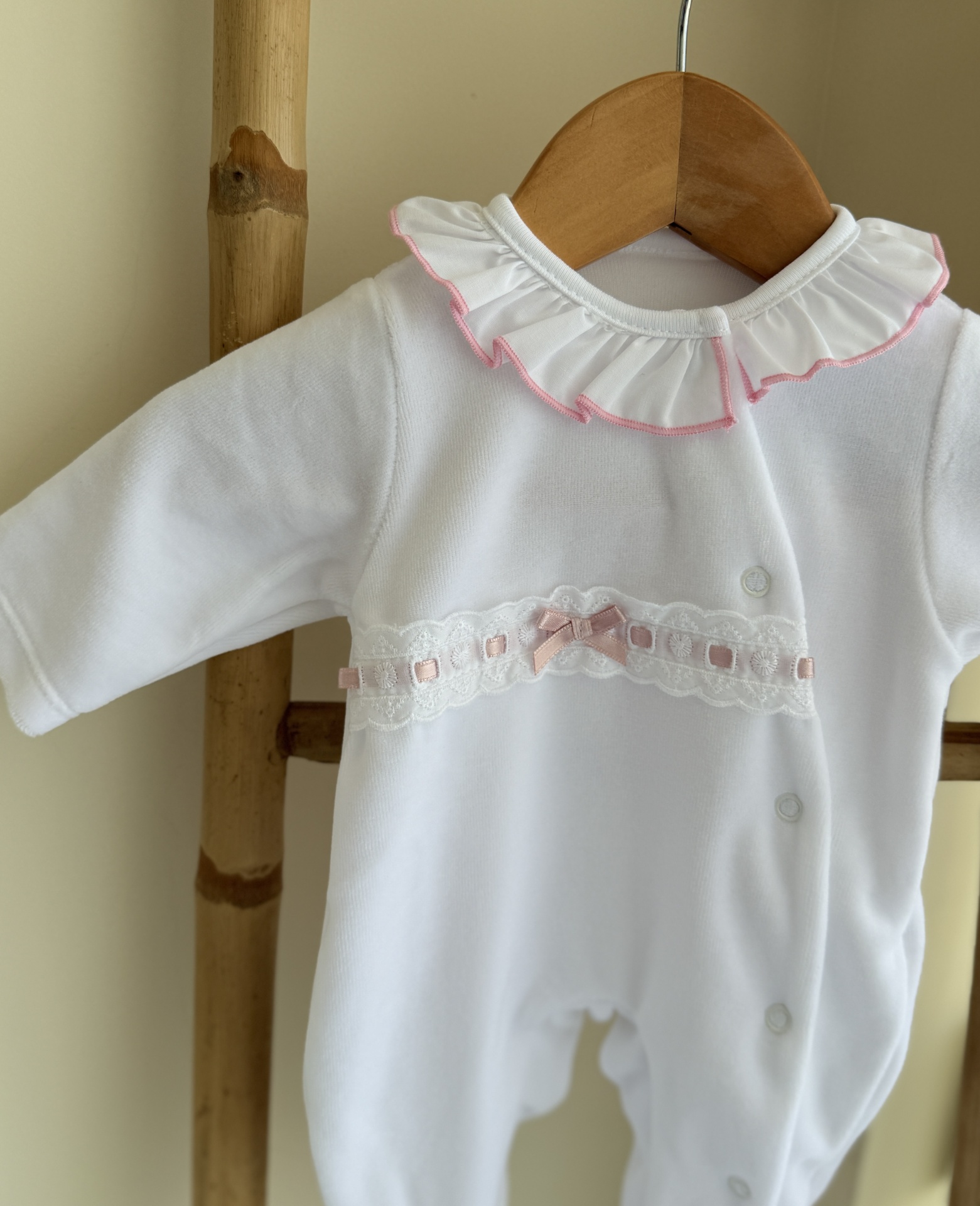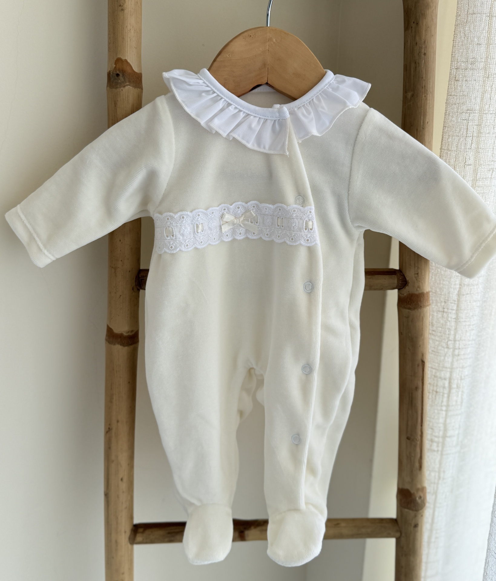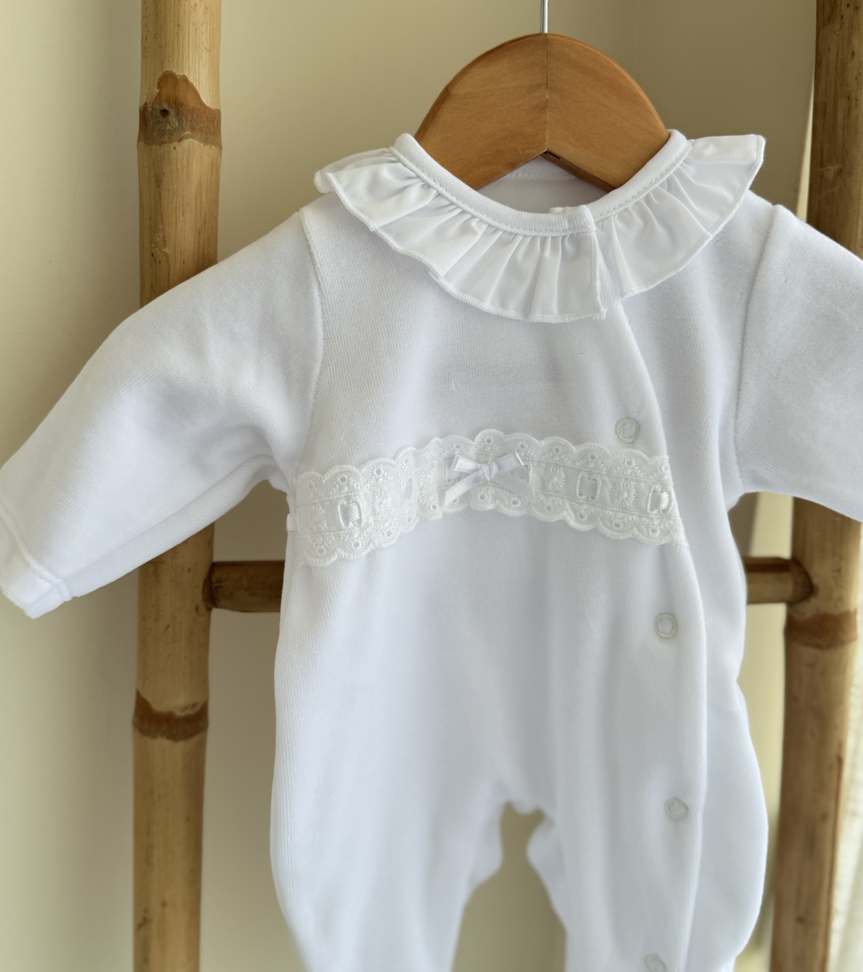 • Macacão de bebé branco com renda e gola franzida pendurado em cabide de madeira