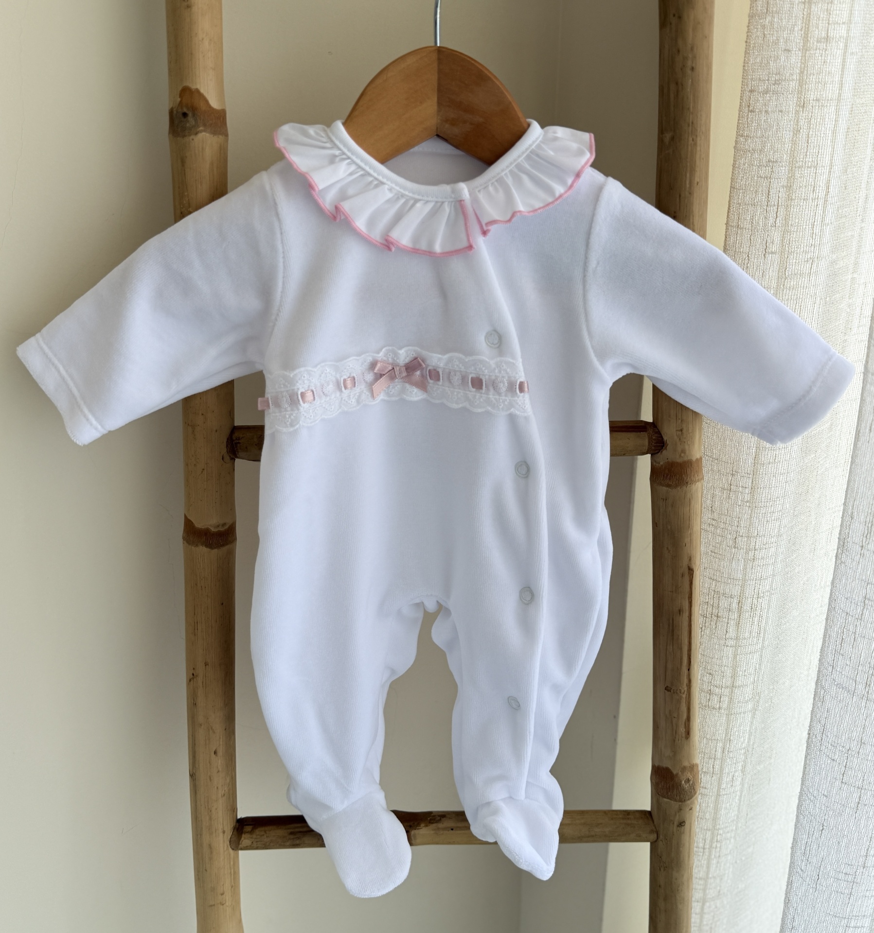• Macacão de bebé branco com folho no colarinho e renda com fita rosa