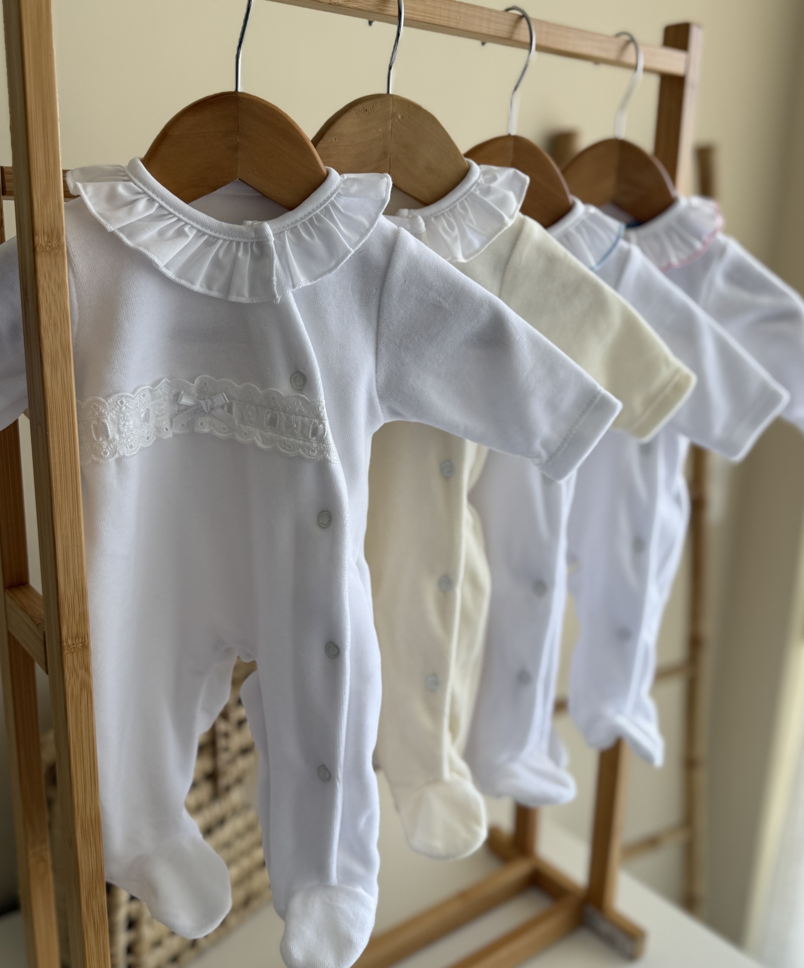 • Macacões de bebé brancos e creme pendurados em cabides de madeira com golas franzidas e botões laterais.