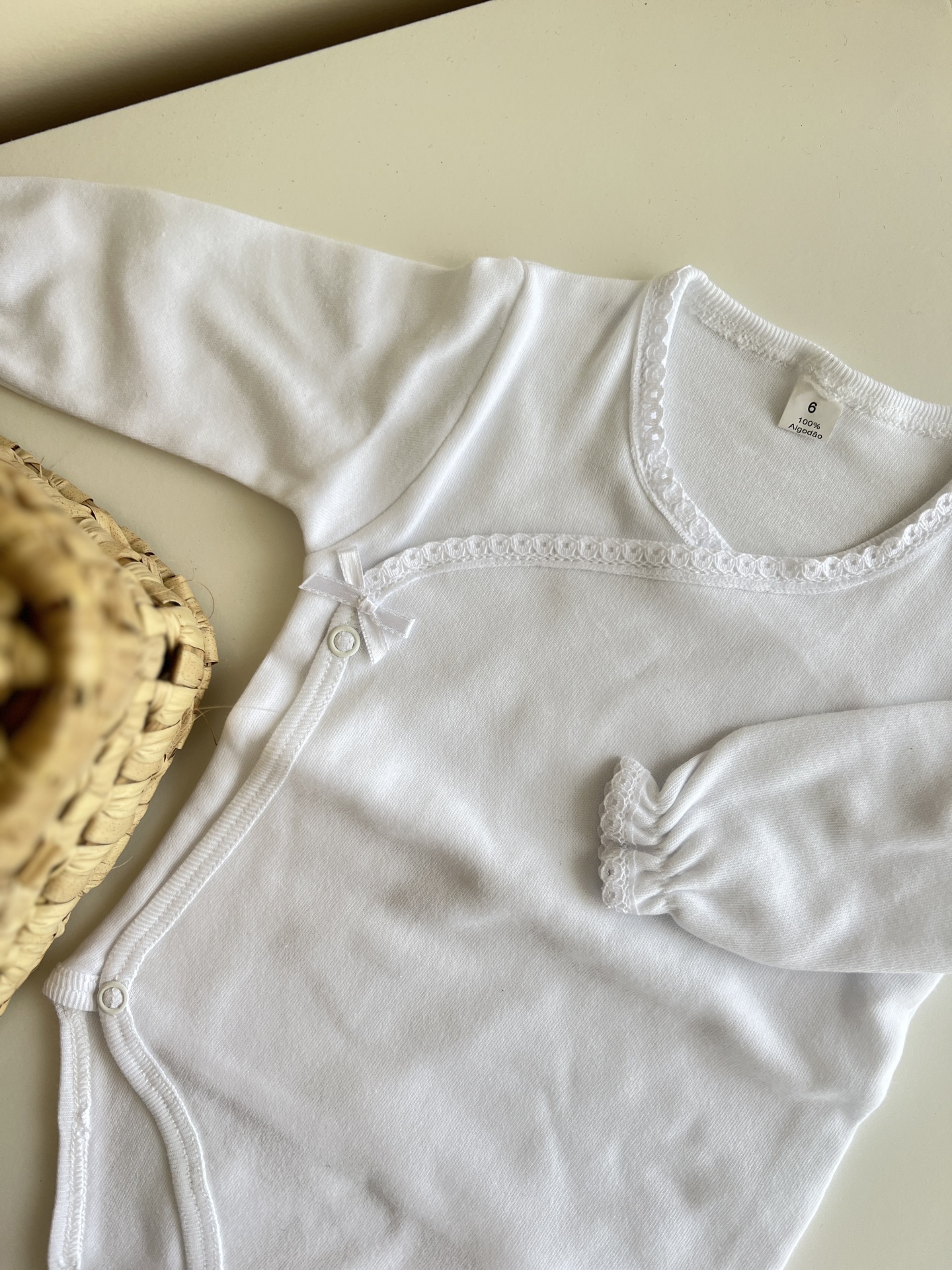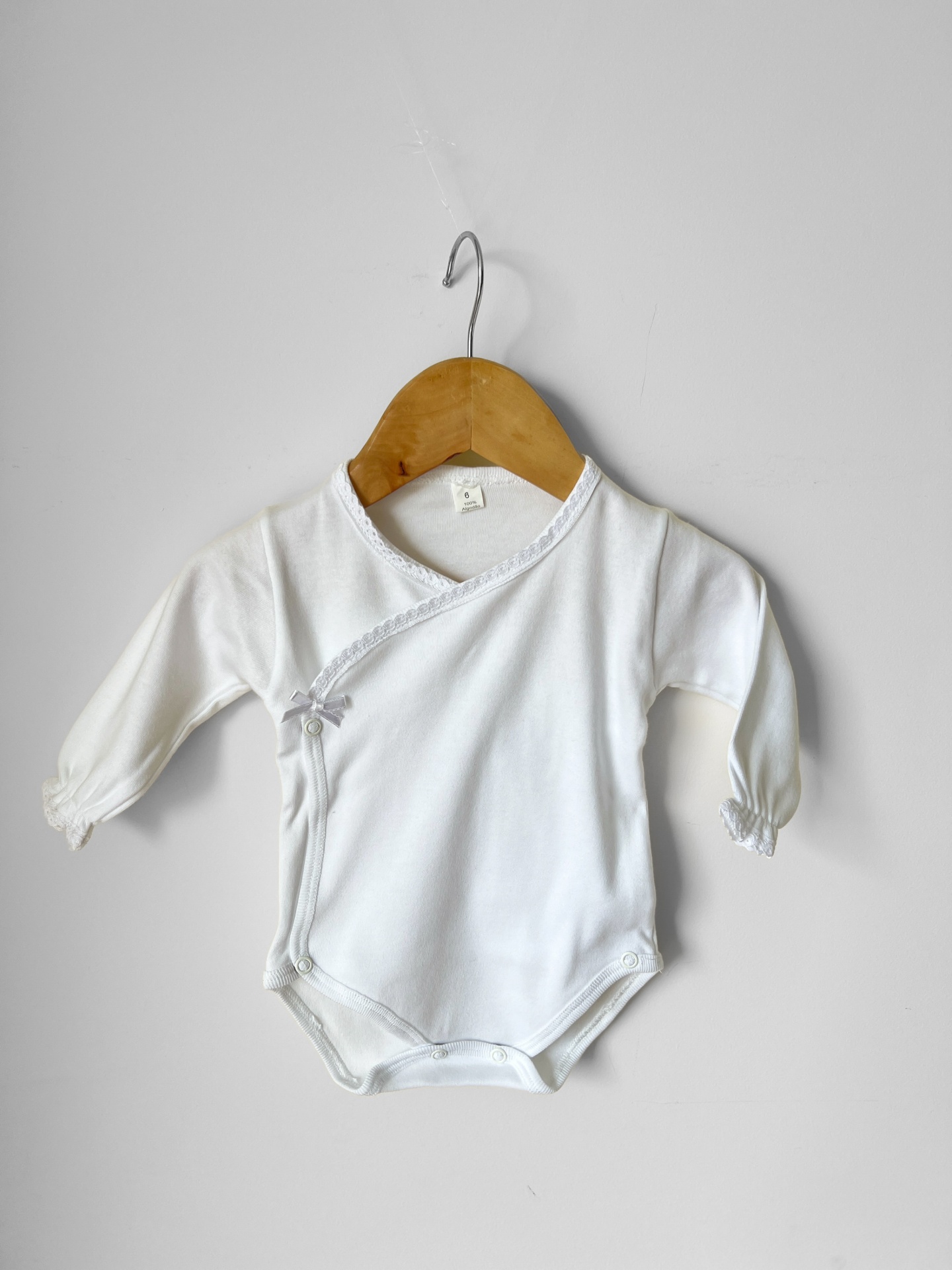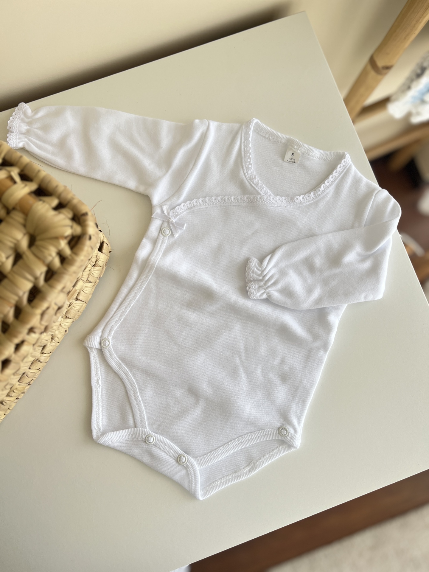 • Body de bebé branco com manga comprida e fecho cruzado