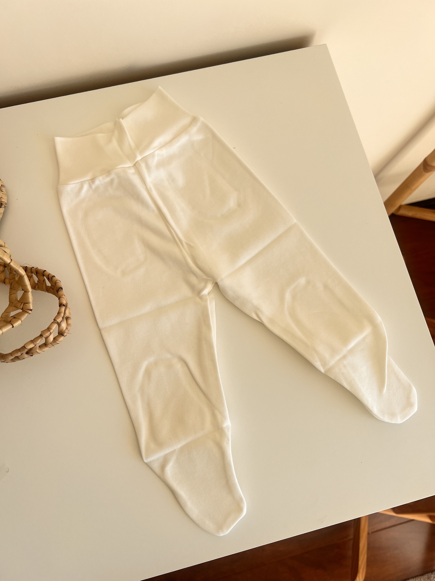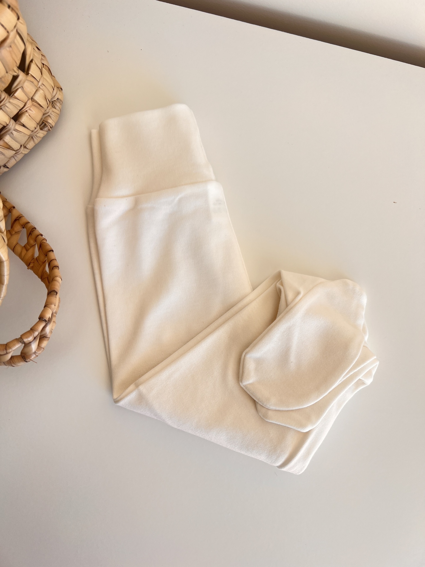• Leggings brancas cremosas em tecido macio sobre mesa branca próximo a cesta de palha