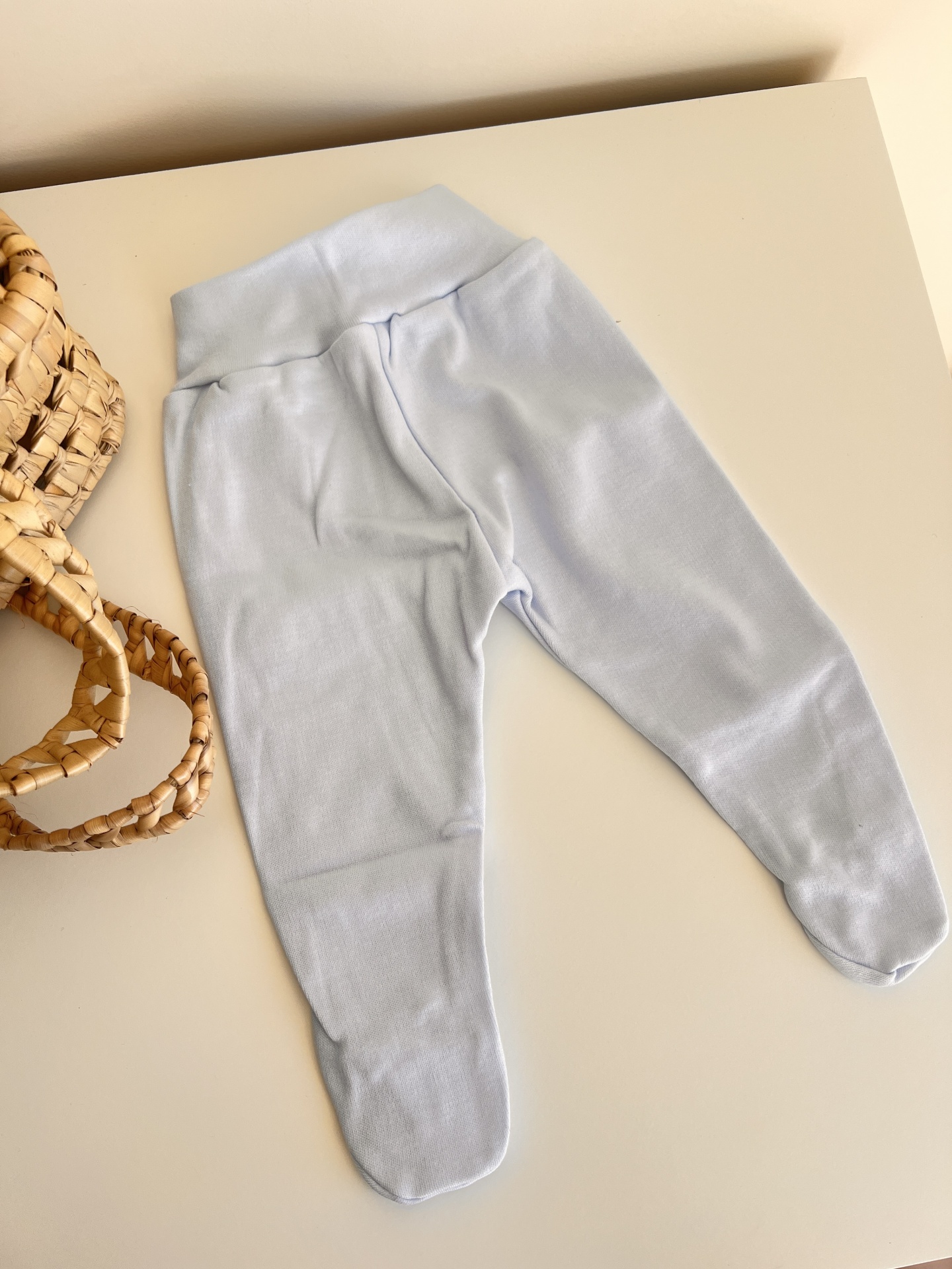 • Calças azuis claras para bebé com pés fechados sobre superfície branca