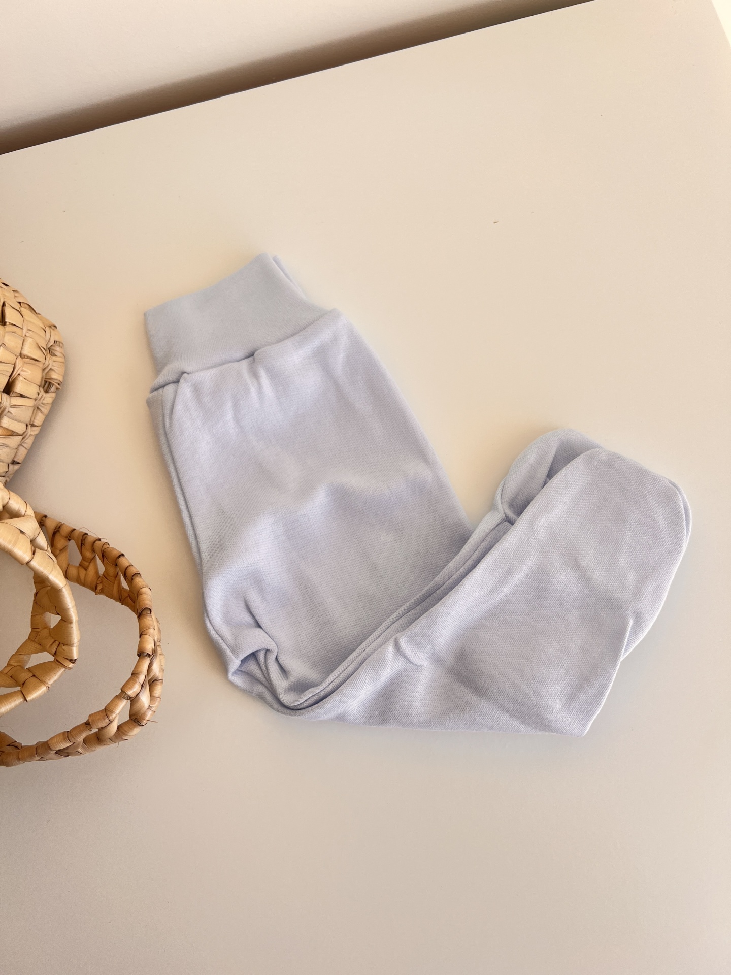 • Calças de criança azul claro com bainha elástica colocadas sobre superfície branca ao lado de cesta de vime
