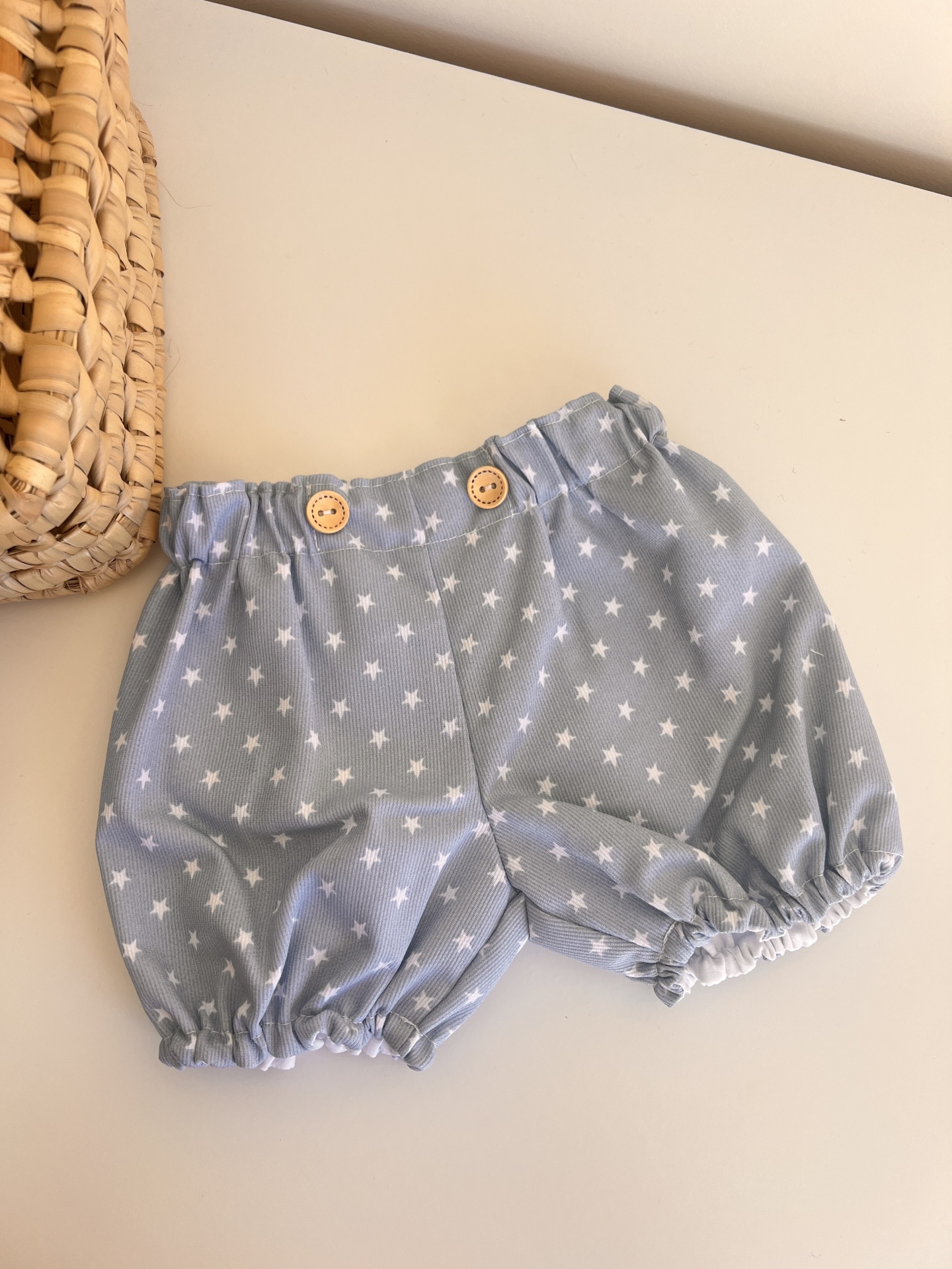 • Calções de bebé azuis com estrelas brancas e botões de madeira