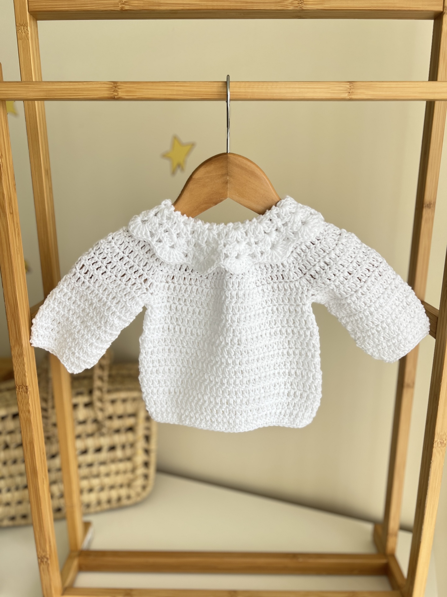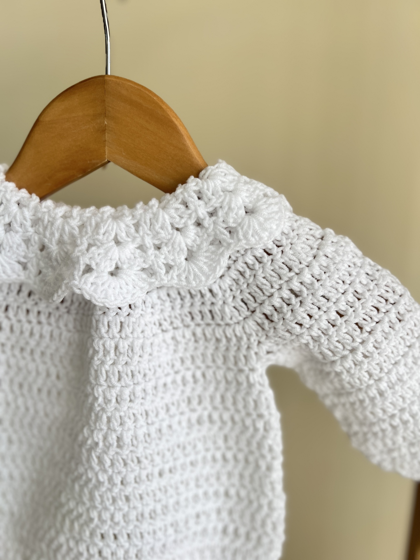 • Camisola branca para bebé em croché pendurada num cabide