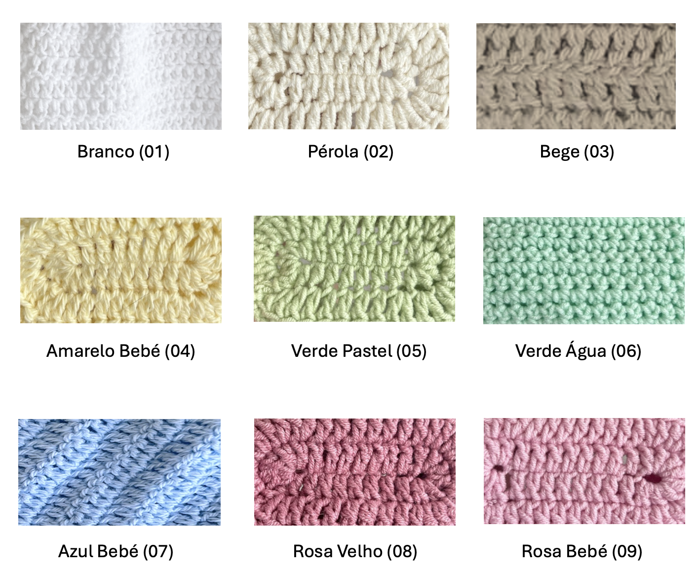• Amostras coloridas de tecido em crochê com nomes e códigos de cor