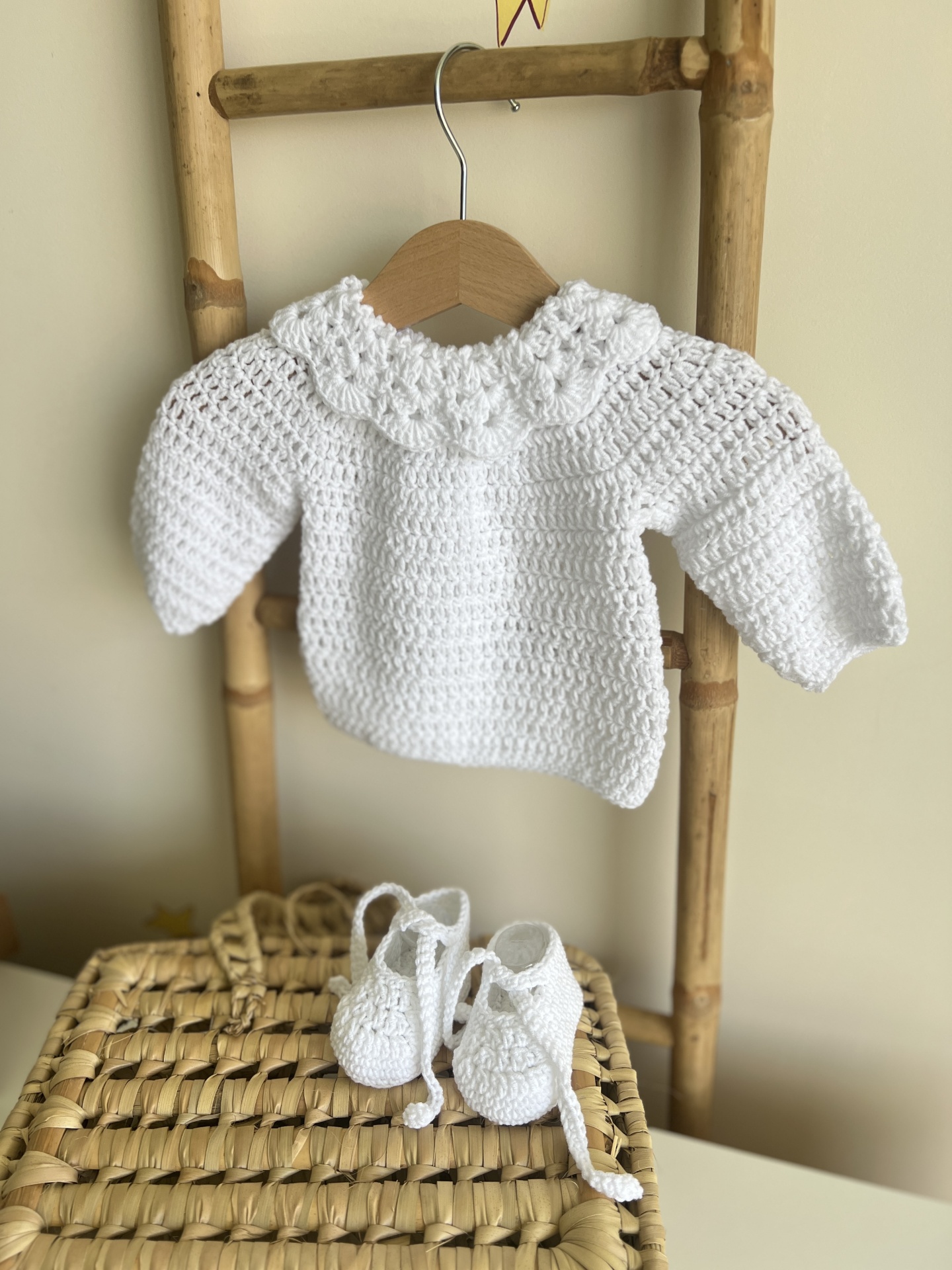 • Conjunto de bebé em crochê branco com camisola e sapatinhos