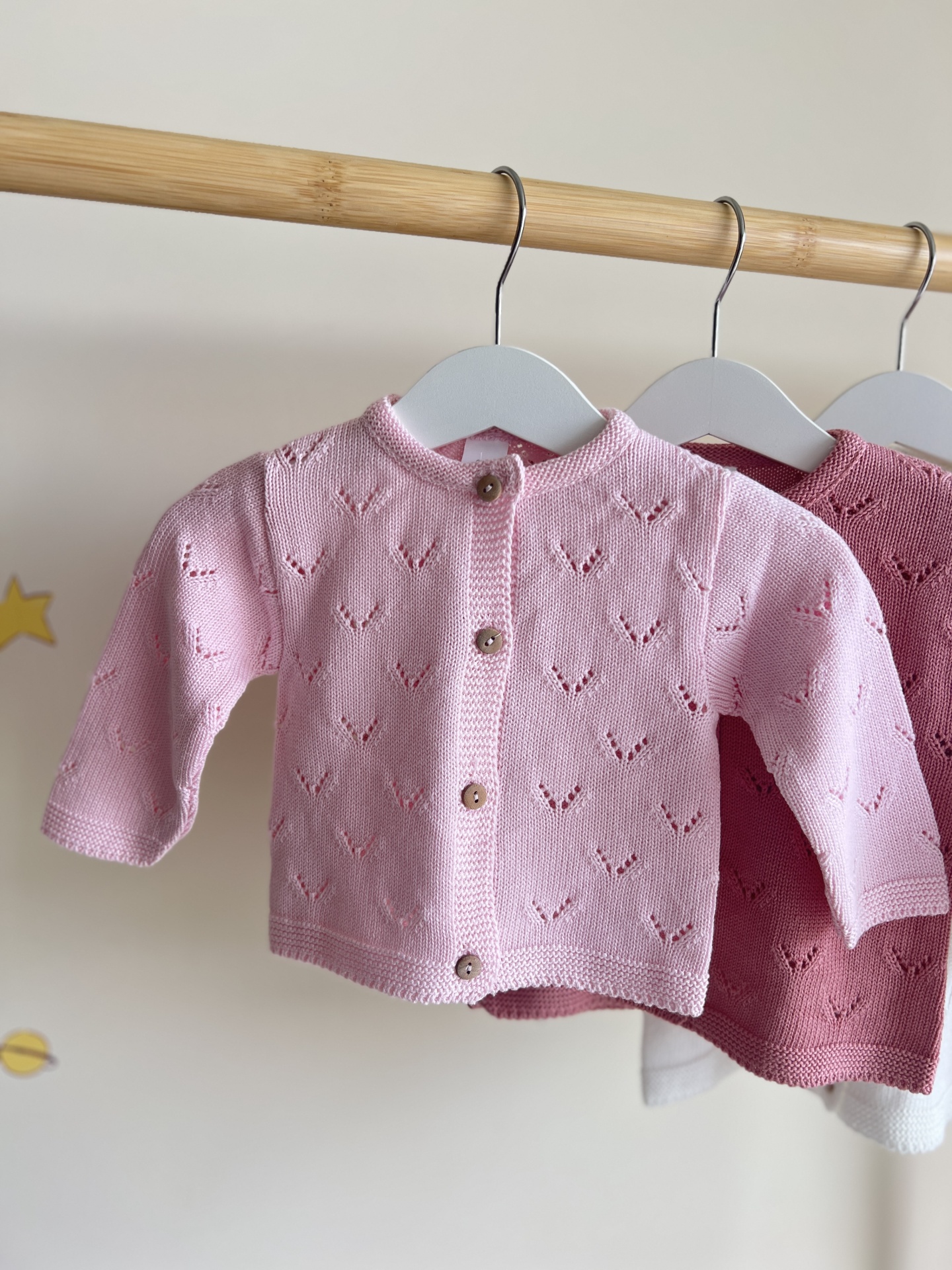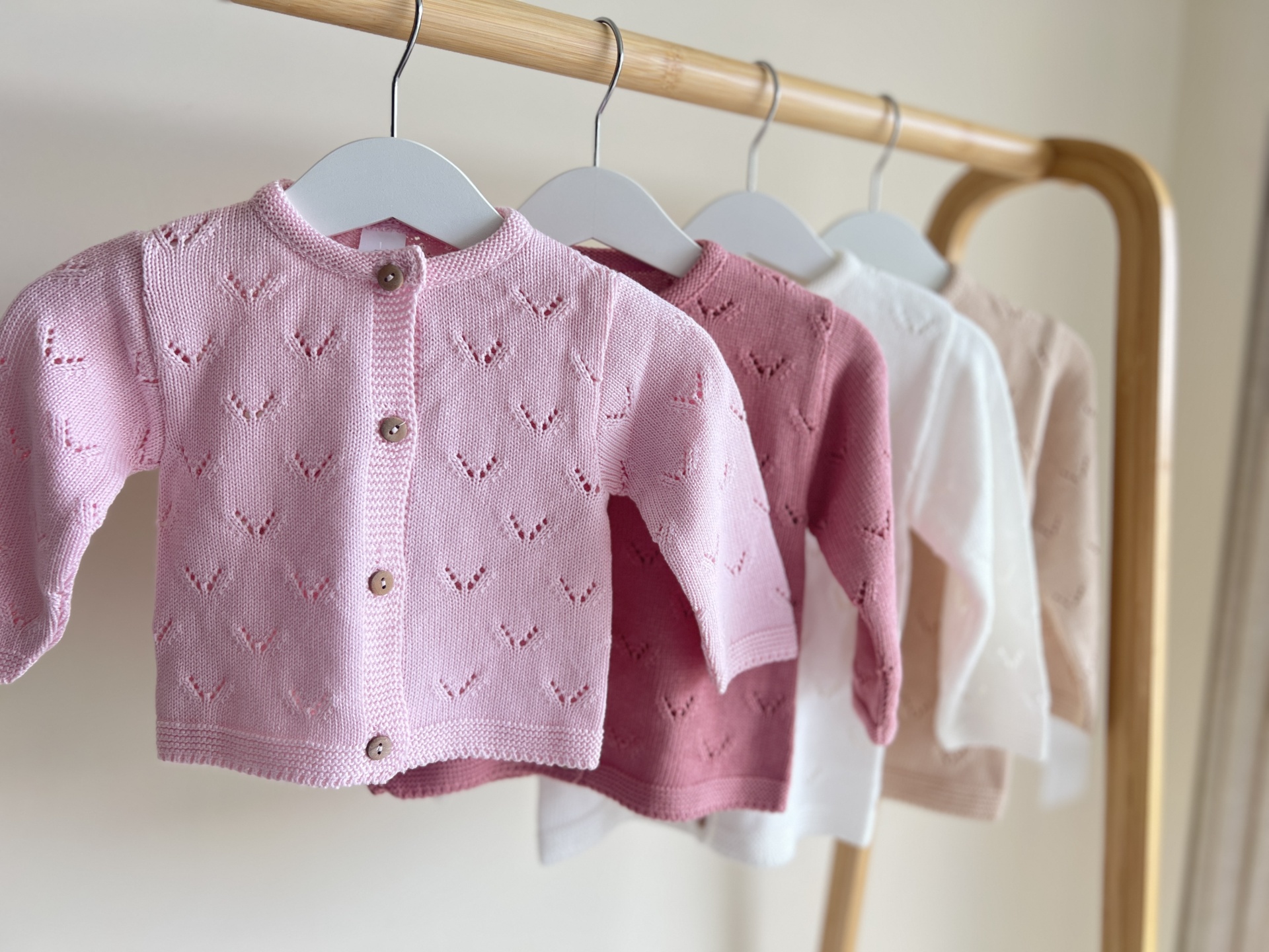 • Três casacos de malha para bebé de cores rosa claro, rosa escuro e branco pendurados em cabides de madeira