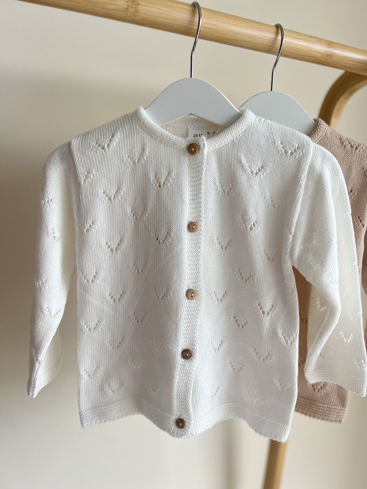 • Casaco de malha branco para bebé com botões de madeira pendurado num cabide.