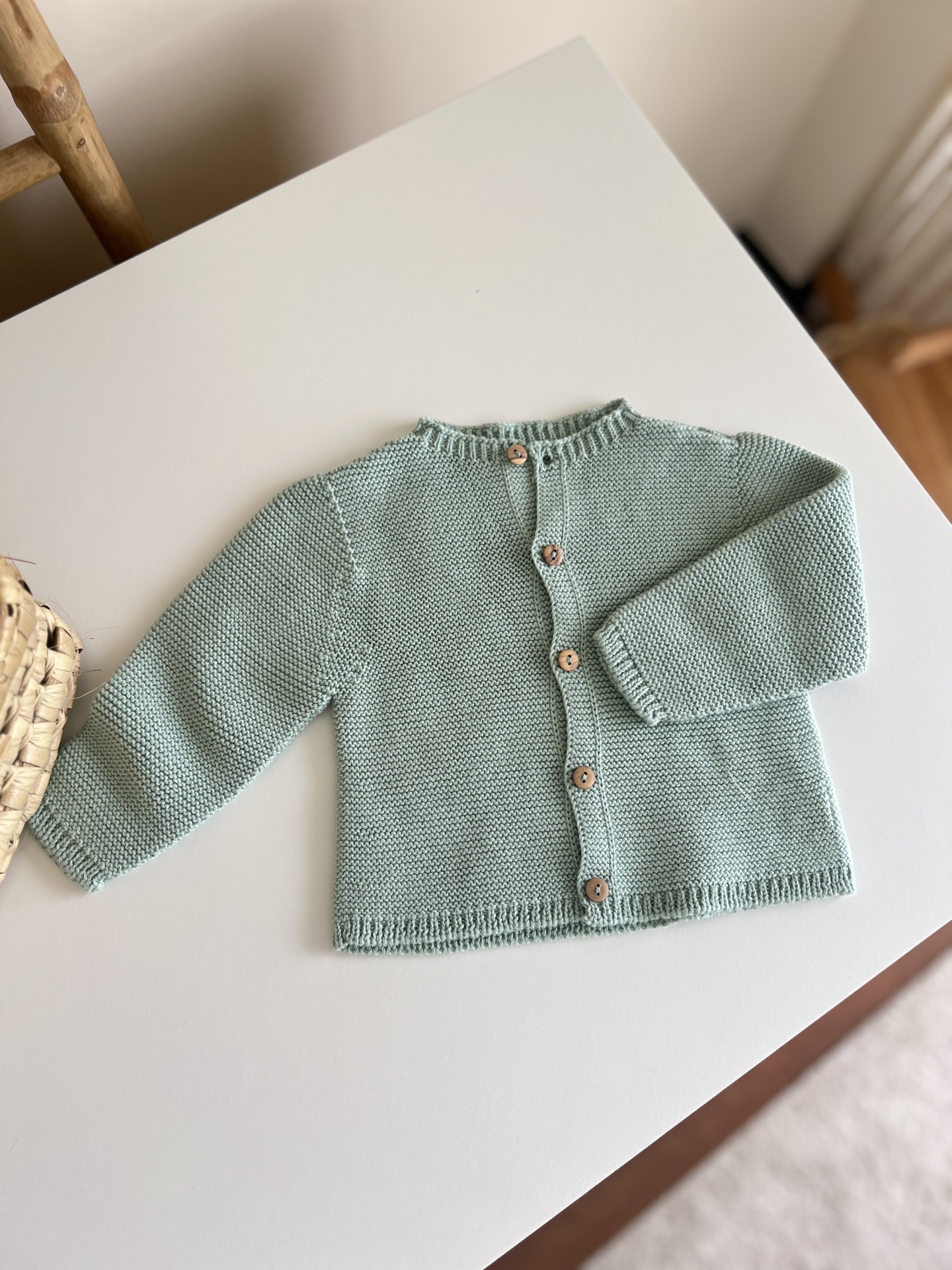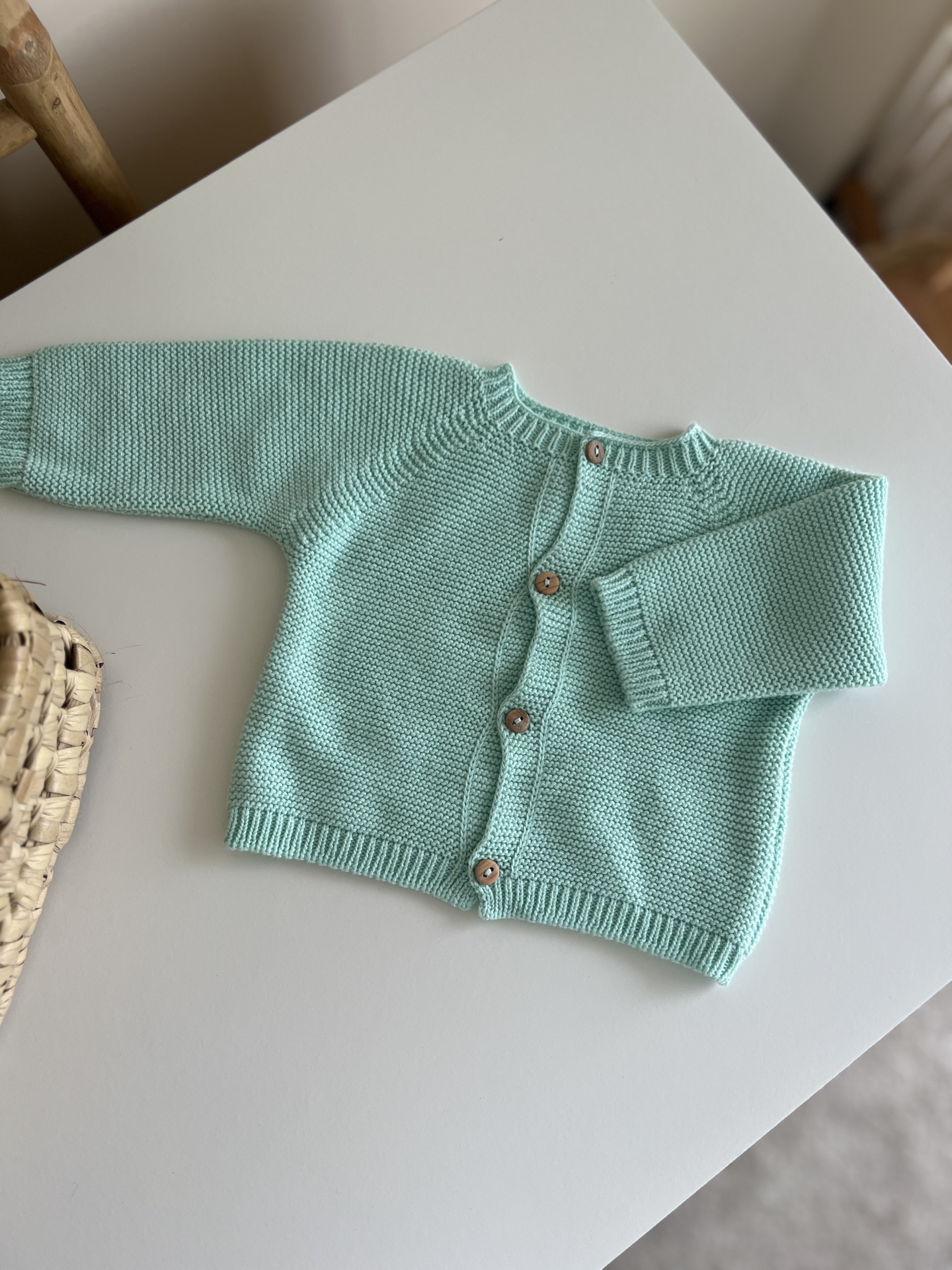 • Camisola de malha infantil verde água com botões de madeira sobre mesa branca