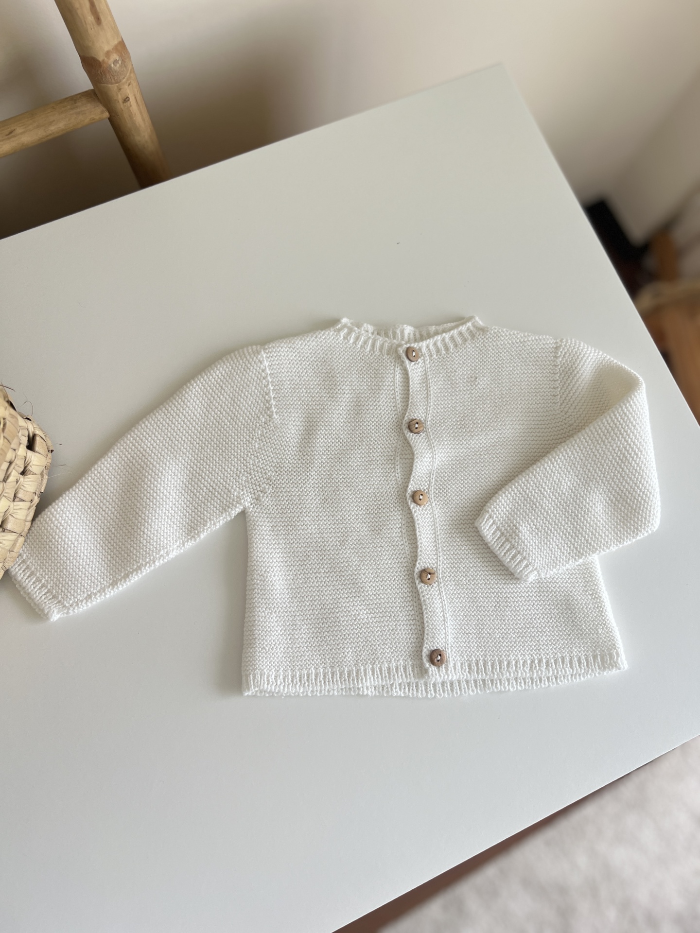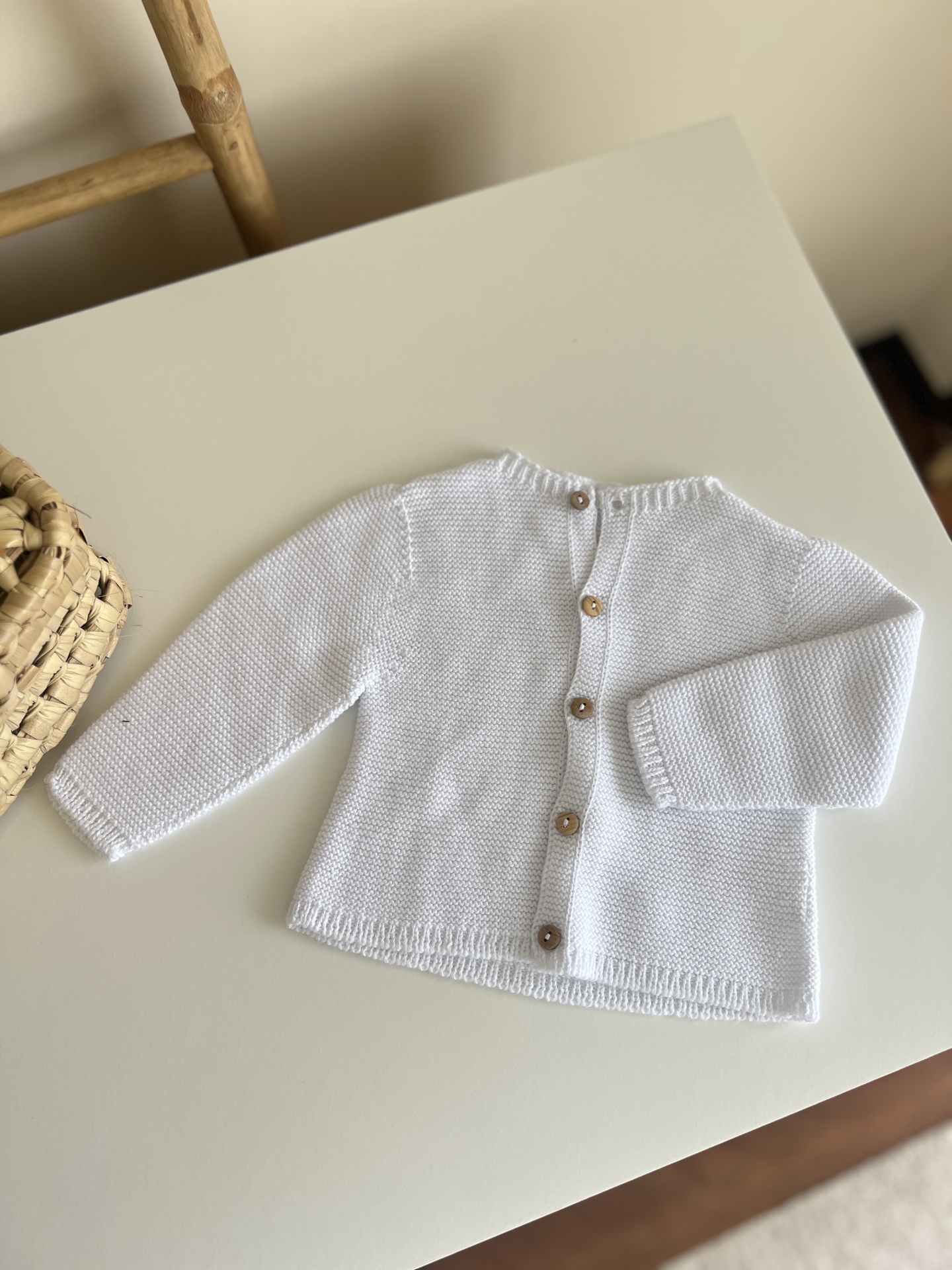 • Cardigã branco para bebé de malha com botões castanhos sobre mesa branca.