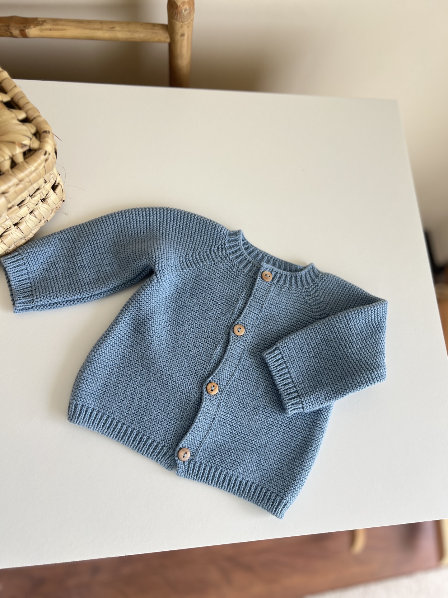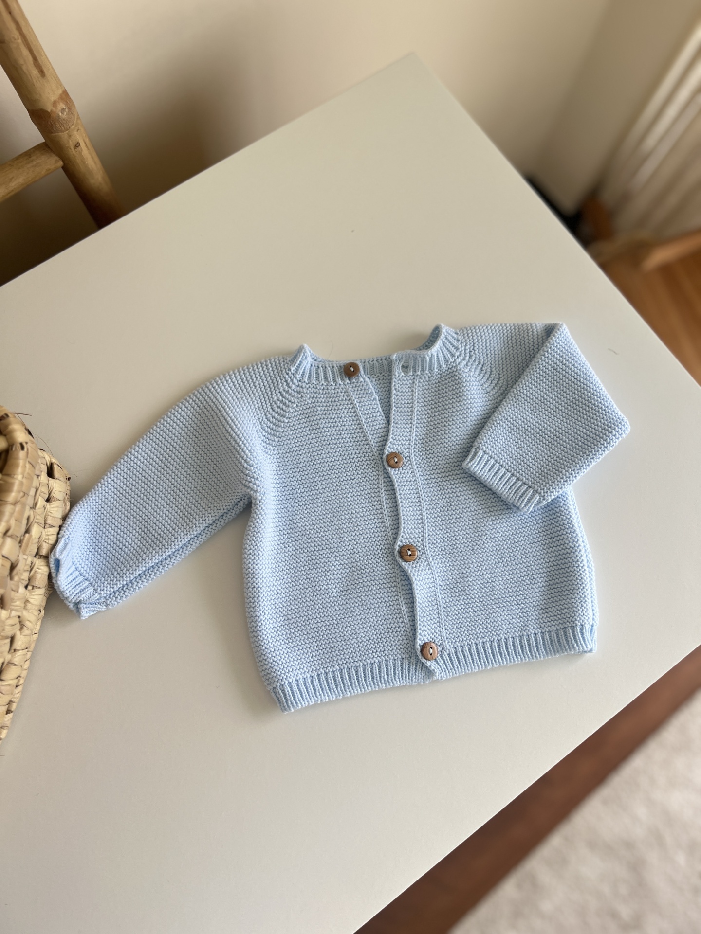 • Casaquinho azul claro de malha com botões de madeira numa mesa clara