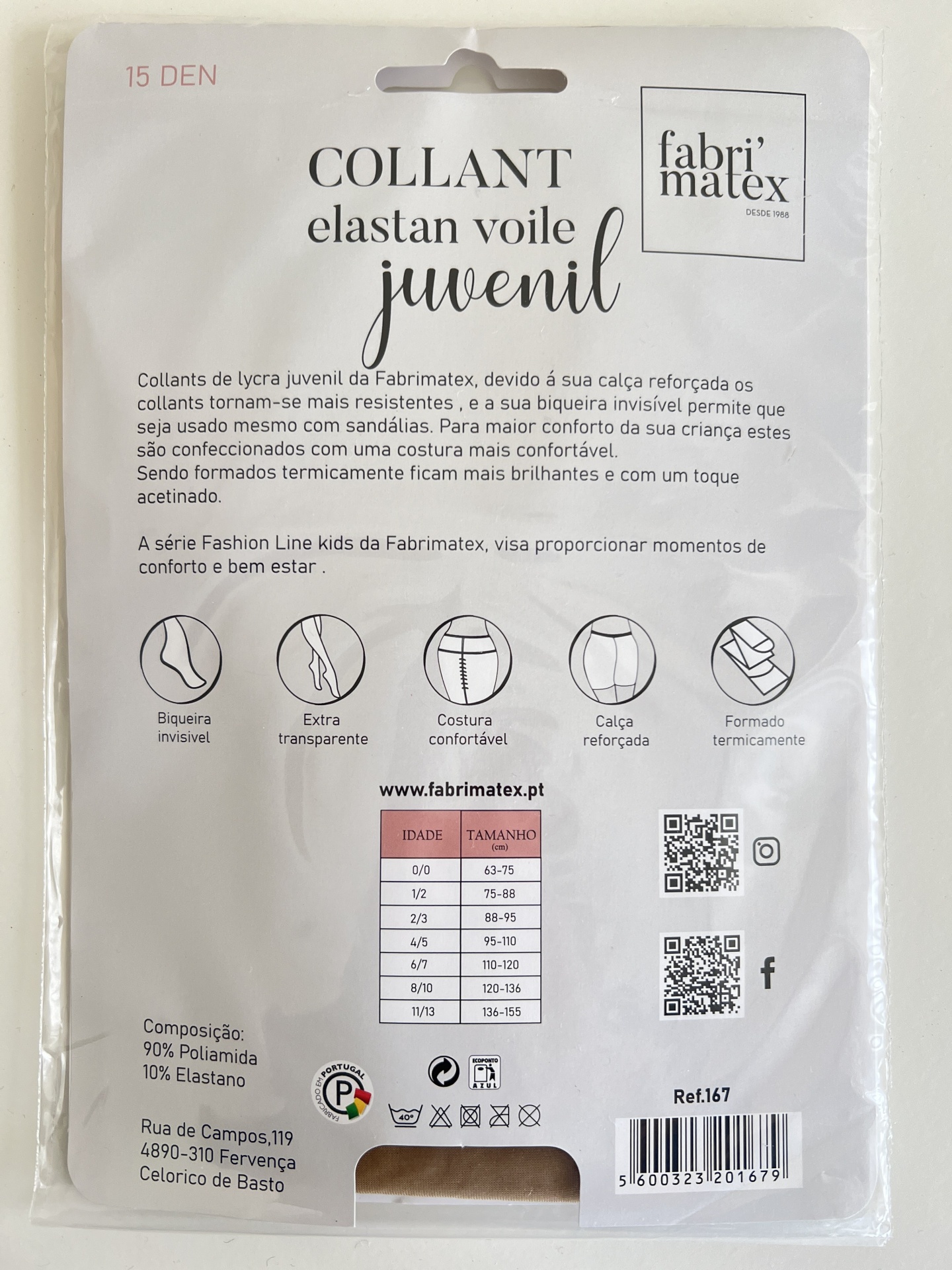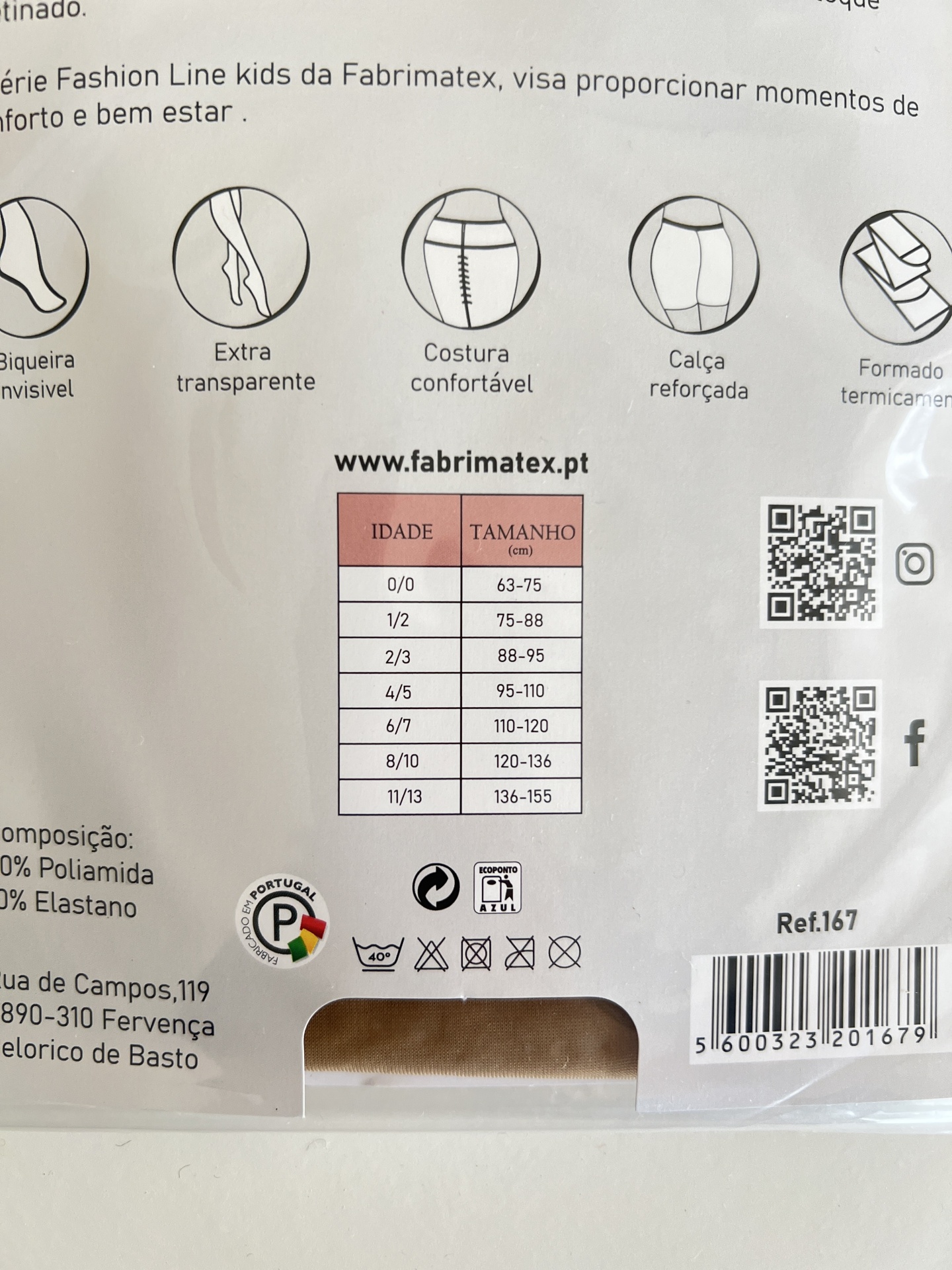 Collants Lycra 2,50 € Desconto de %. Partilhar Tamanho 1/2 2/3 4/5 6/7 8/10 11/13 Comprar Contactar 0 unidades em stock Collant de criança em lycra, com biqueira invisível que permite usar com sandálias e reforçada na zona da cintura. Composição: 90% poliamida 10% elastano Nota: a cor Duna é o tom mais claro e a cor Muskade e o tom mais escuro. O tamanho está por anos. Na ausência de stock, demora cerca de 7 dias a encomenda. Tags Collants Lycra Características