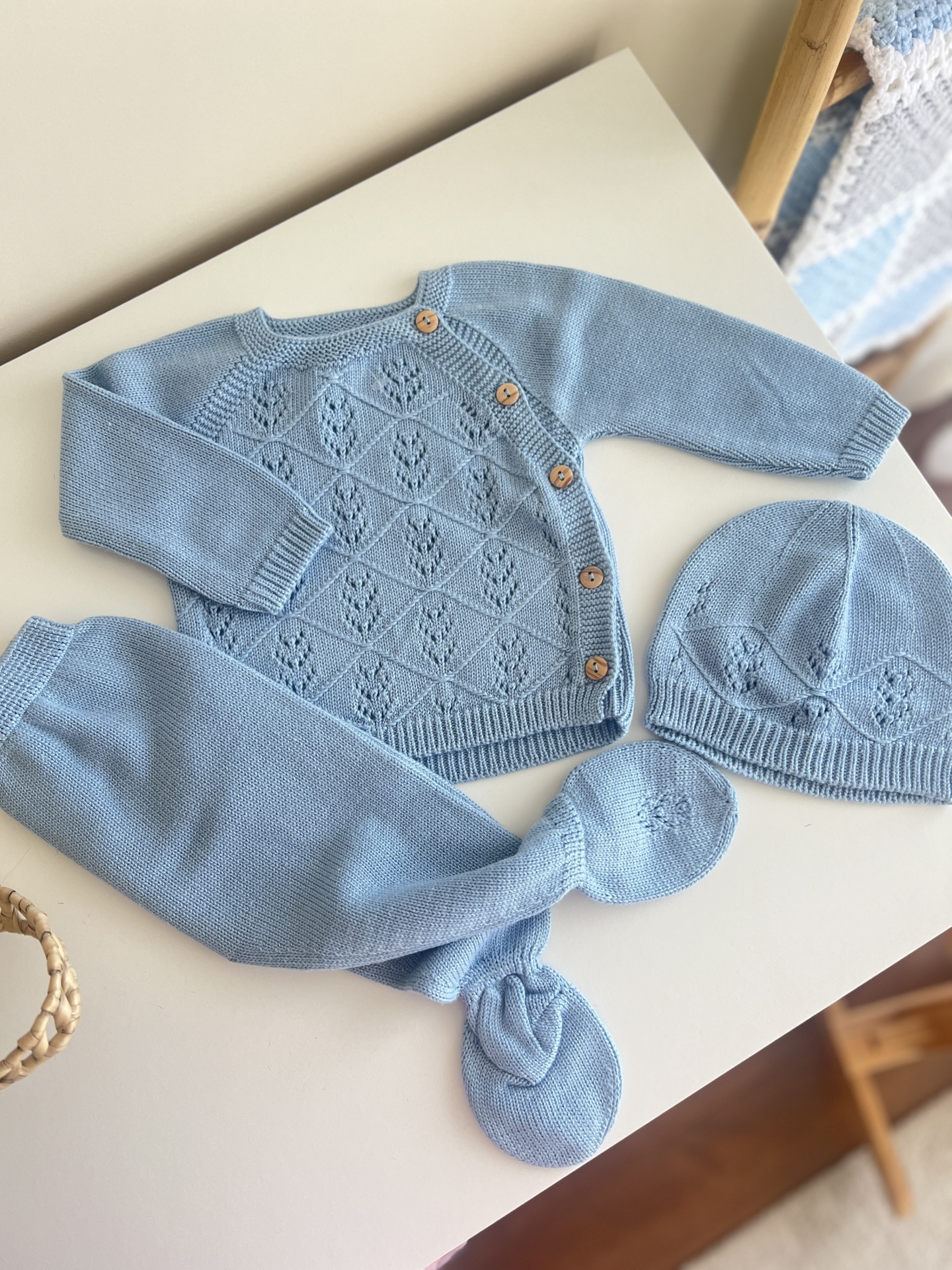 • Conjunto de roupa de bebé azul em malha com camisola, calças e gorro