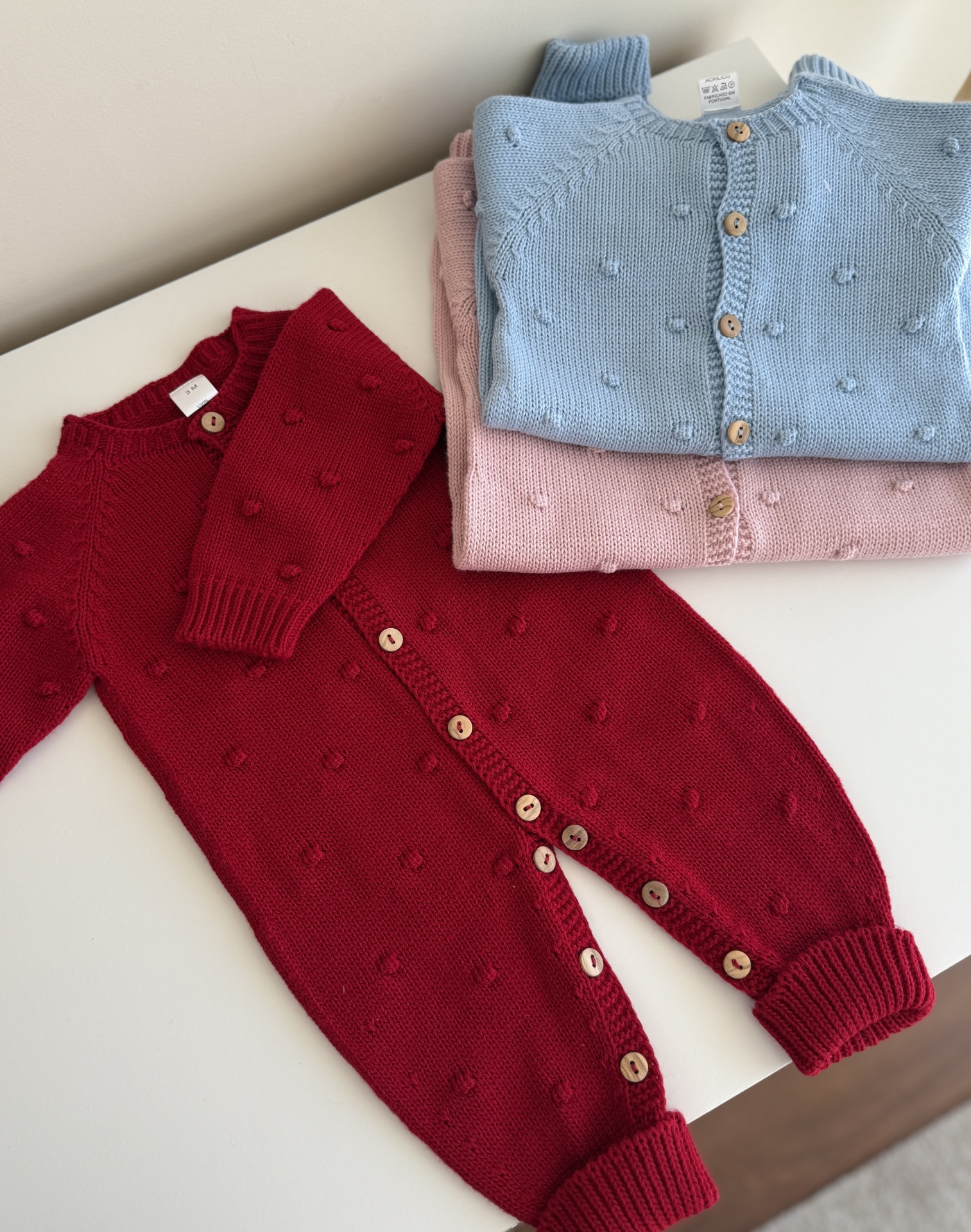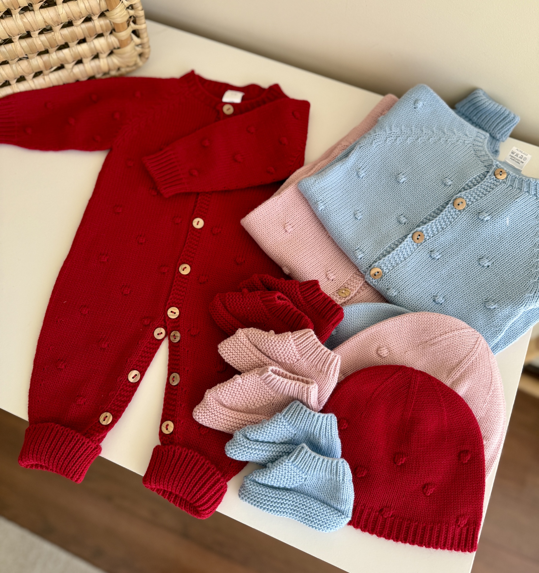 • Conjunto de roupa de bebé de malha em vermelho, azul bebé e rosa, incluindo fato, cardigans, meias e gorros, sobre mesa branca.