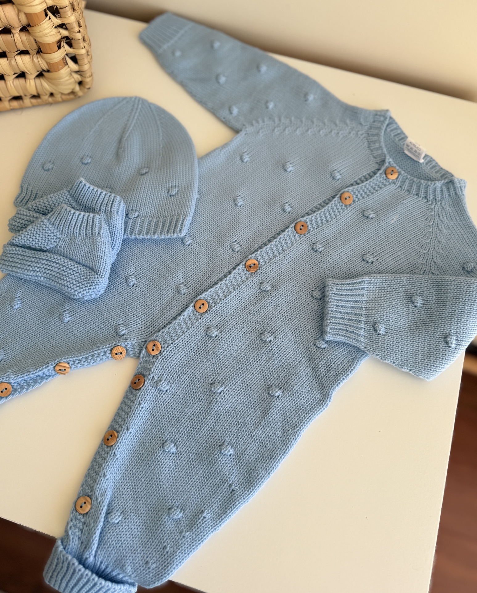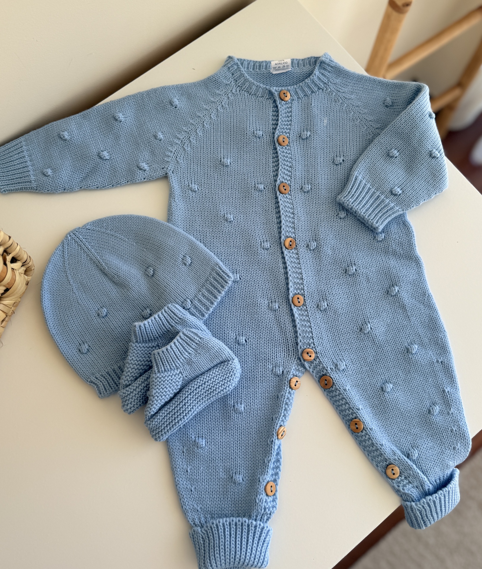 • Conjunto de roupa de bebé azul claro em malha com macacão, touca e luvas, com botões de madeira
