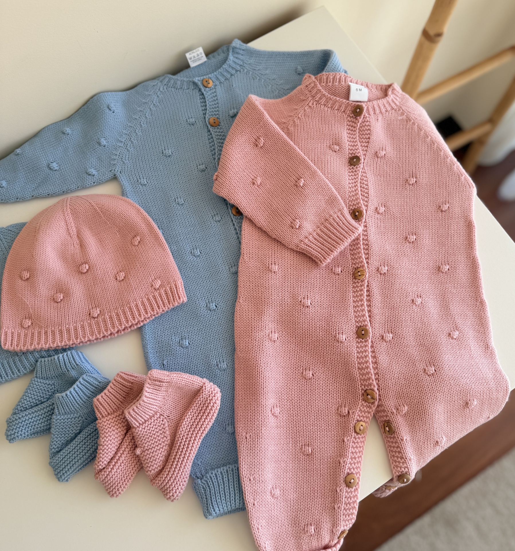 • Conjunto de roupa de bebé em malha com macacão cor-de-rosa e camisola azul, botões de madeira, gorro e peúgas com padrão de bolinhas.