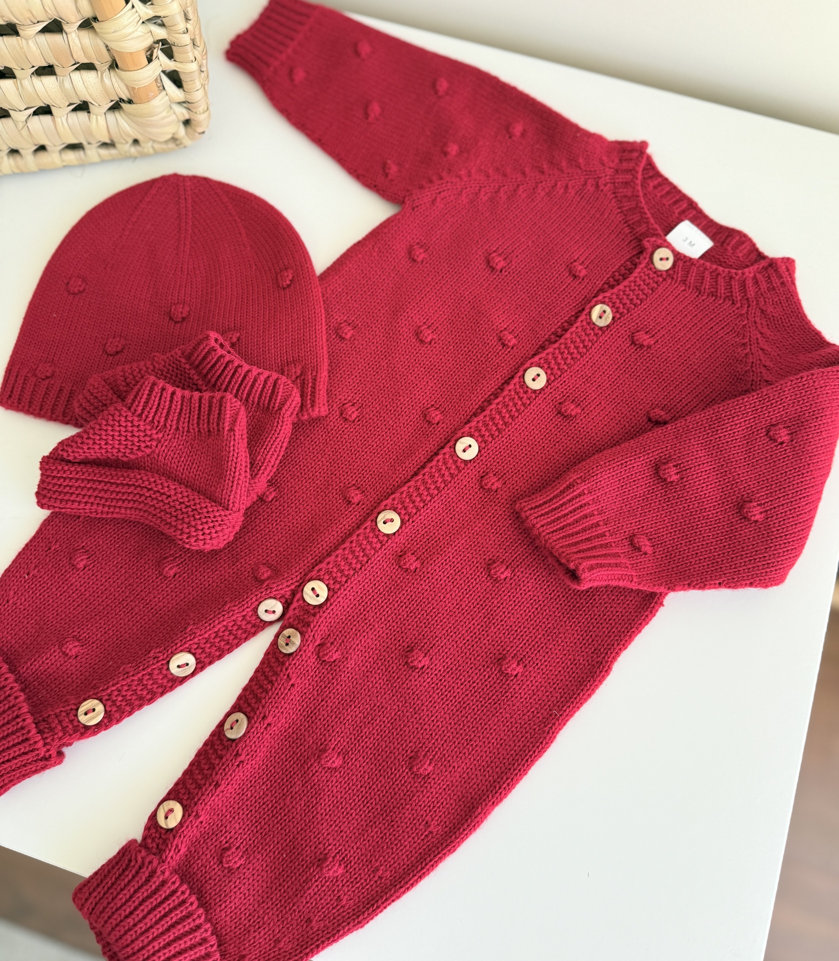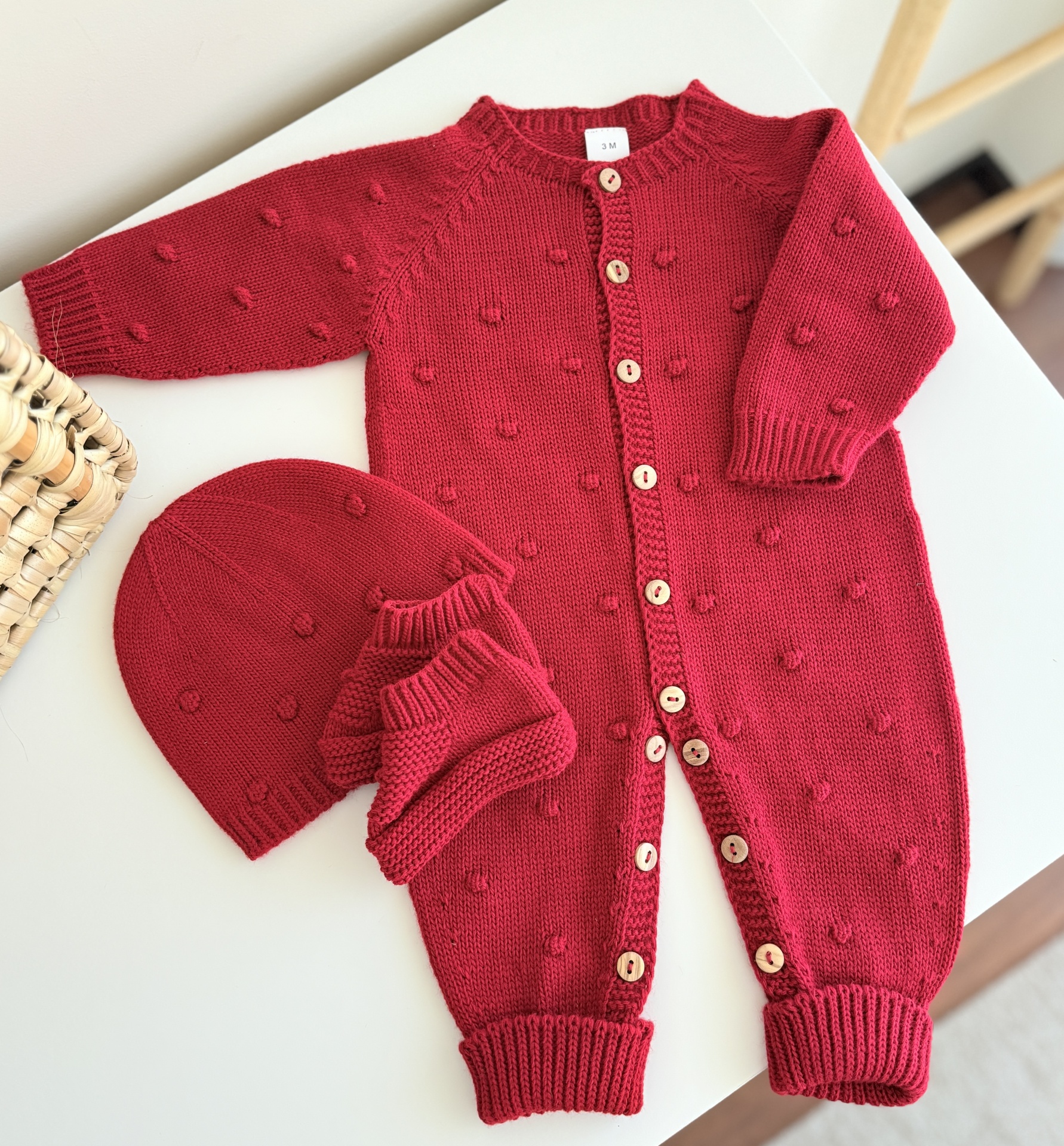 • Conjunto vermelho de bebé com macacão, gorro e luvas em malha com padrão de bolinhas