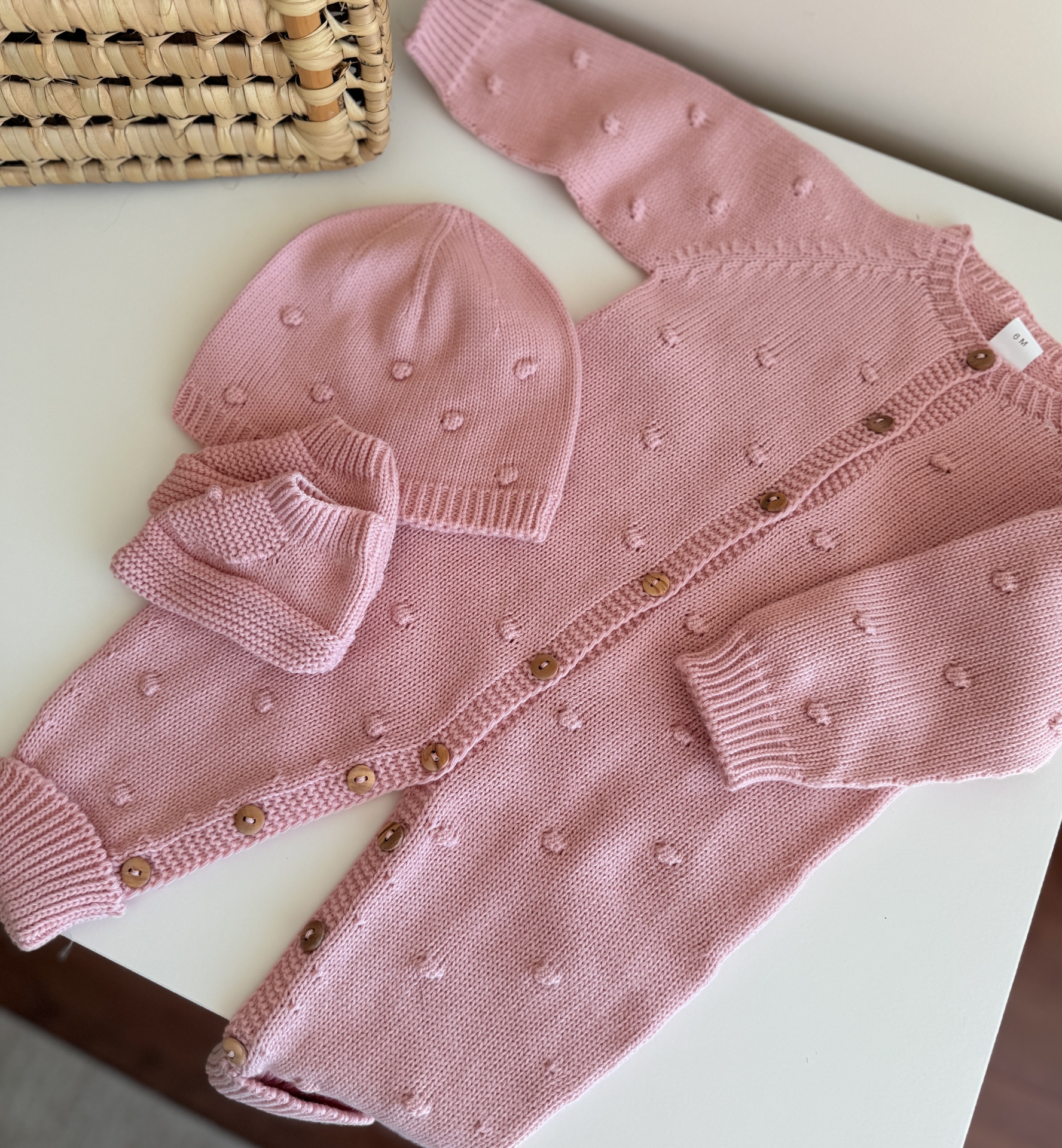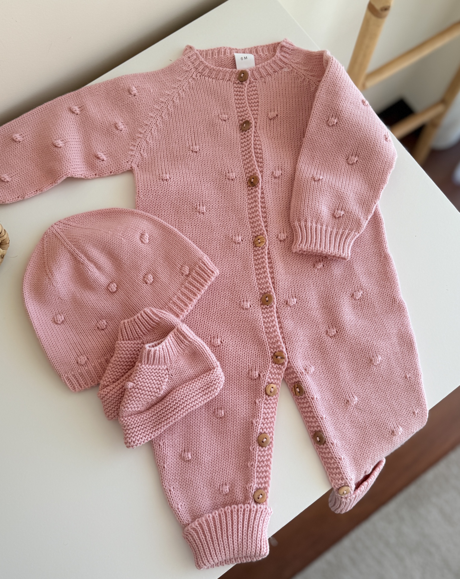 • Conjunto de bebé em malha rosa com padrão de bolinhas e botões de madeira