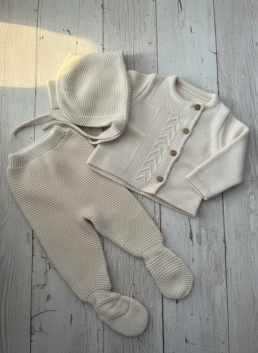 • Conjunto de roupa de bebé de malha creme com gorro, casaquinho e calças sobre chão de madeira branca