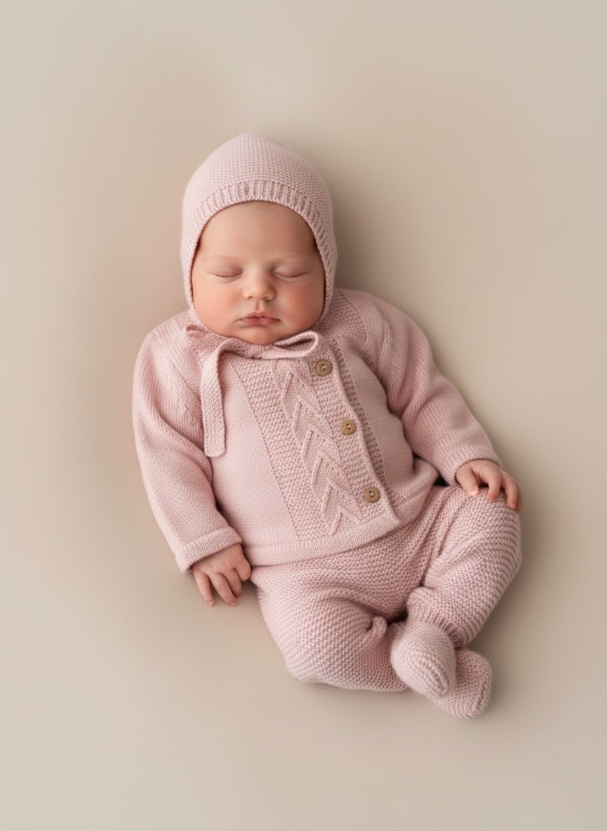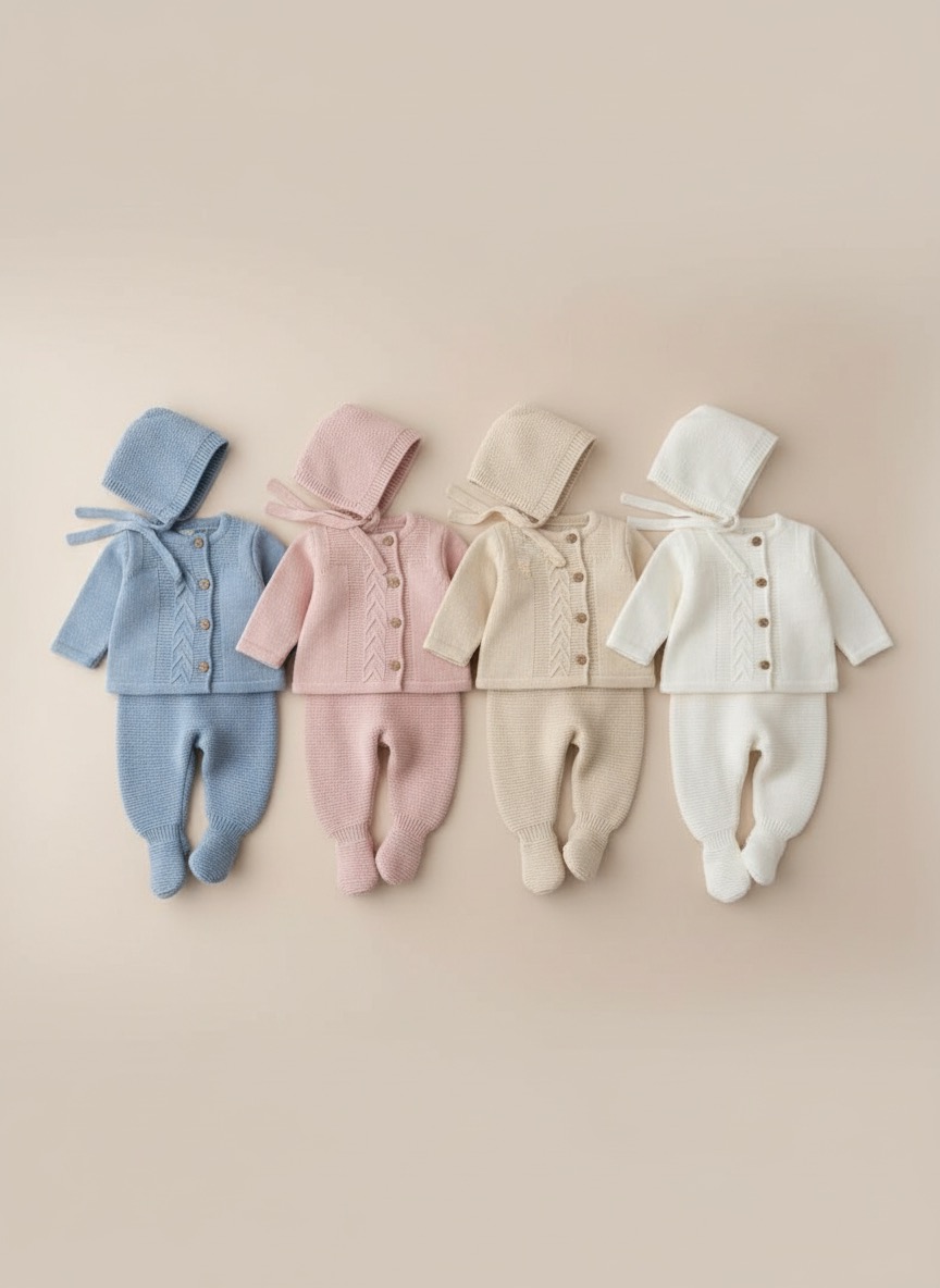 • Conjuntos de roupa de bebé em malha nas cores azul claro, rosa, bege e branco com casaco, calças e capuz