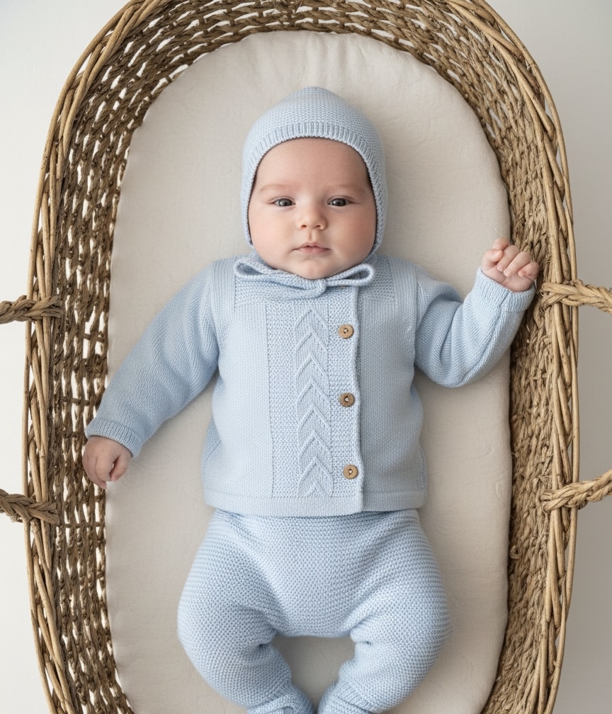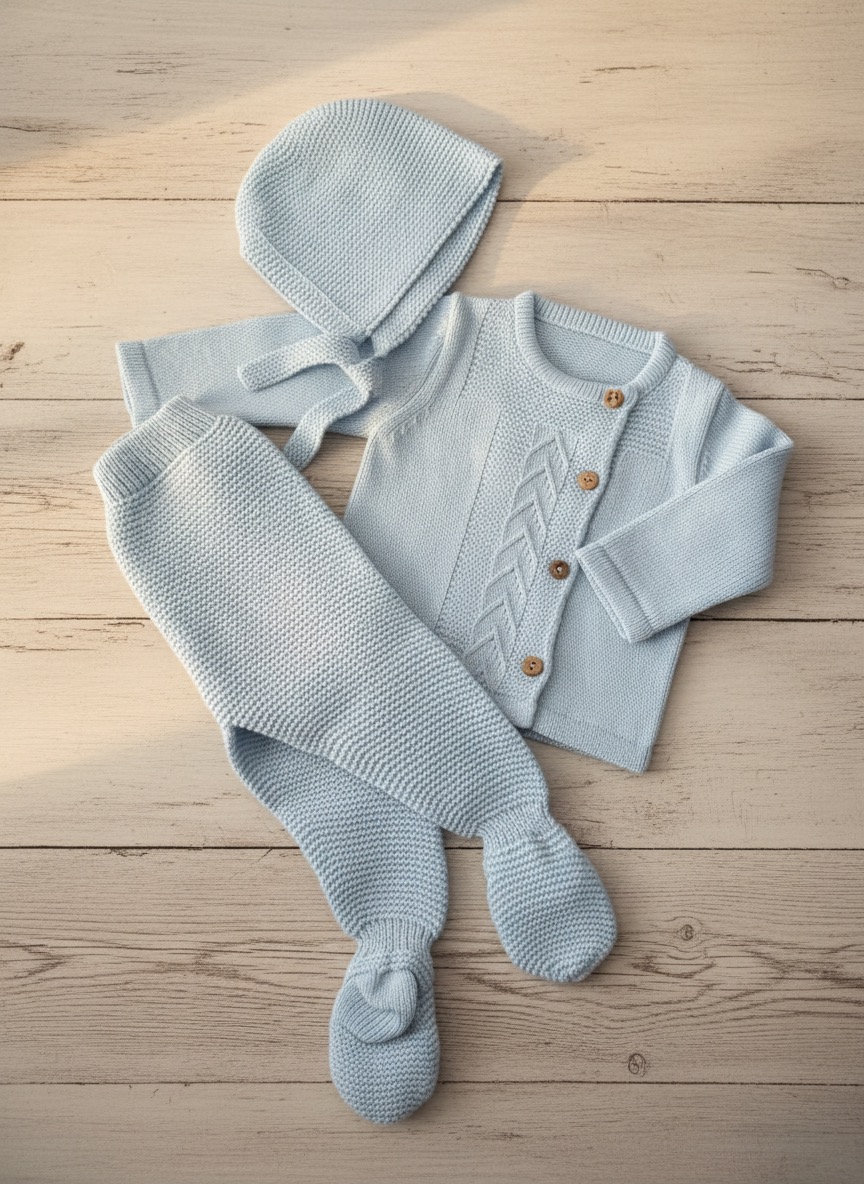 • Conjunto de roupa para bebé azul clara em malha com casaco, calças com pés e gorro