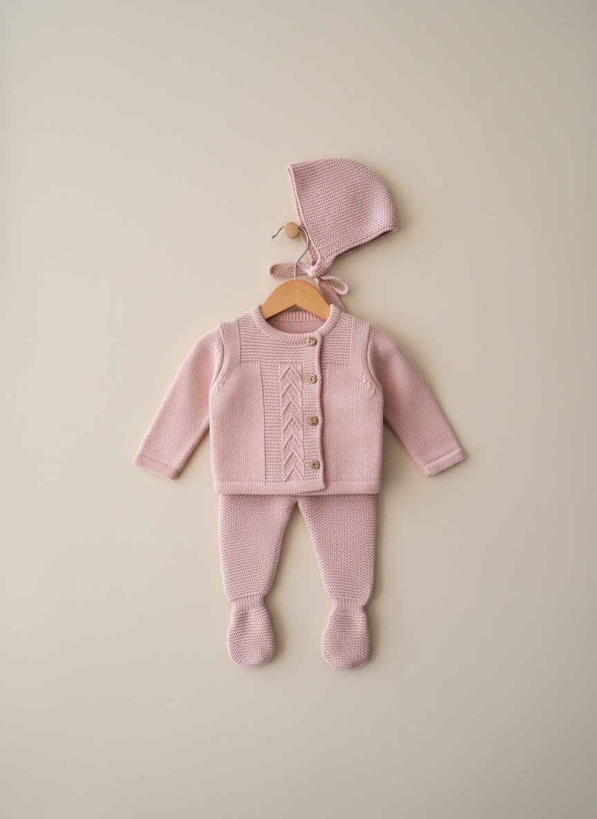 • Conjunto de roupa de bebé em malha rosa claro com casaco, calças com pés e gorro, pendurado numa cabide de madeira