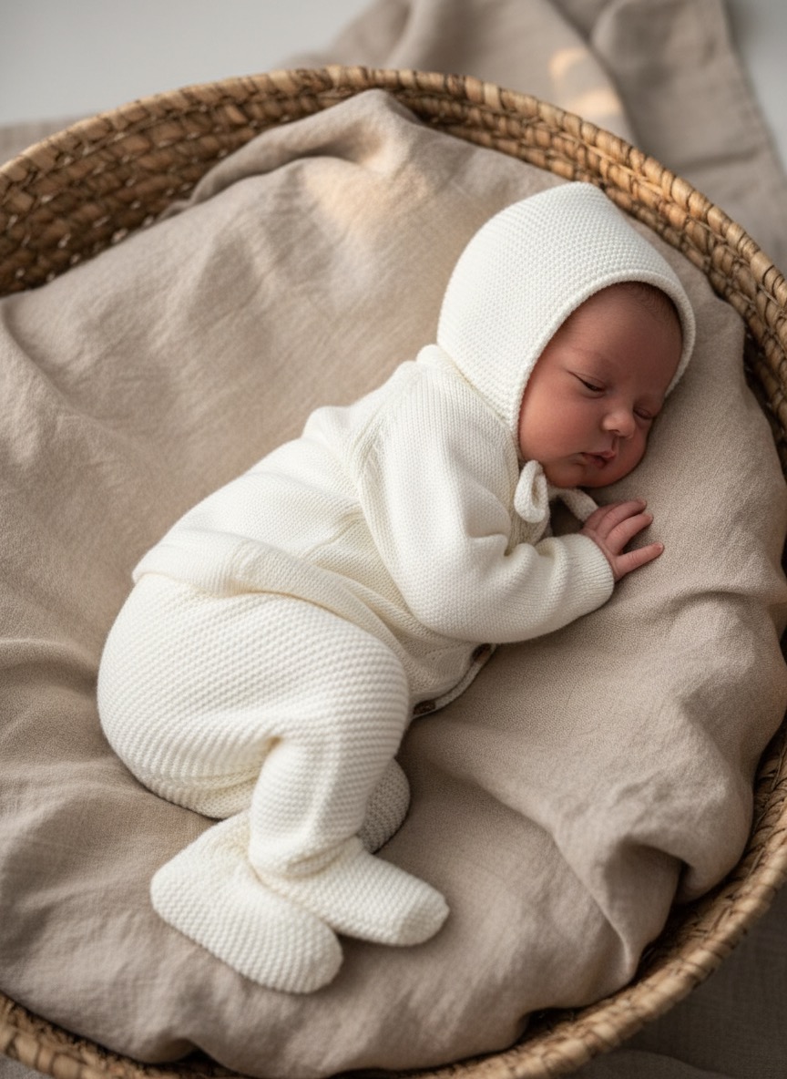 • Bebé deitado em cesto com fato de malha branco e capuz