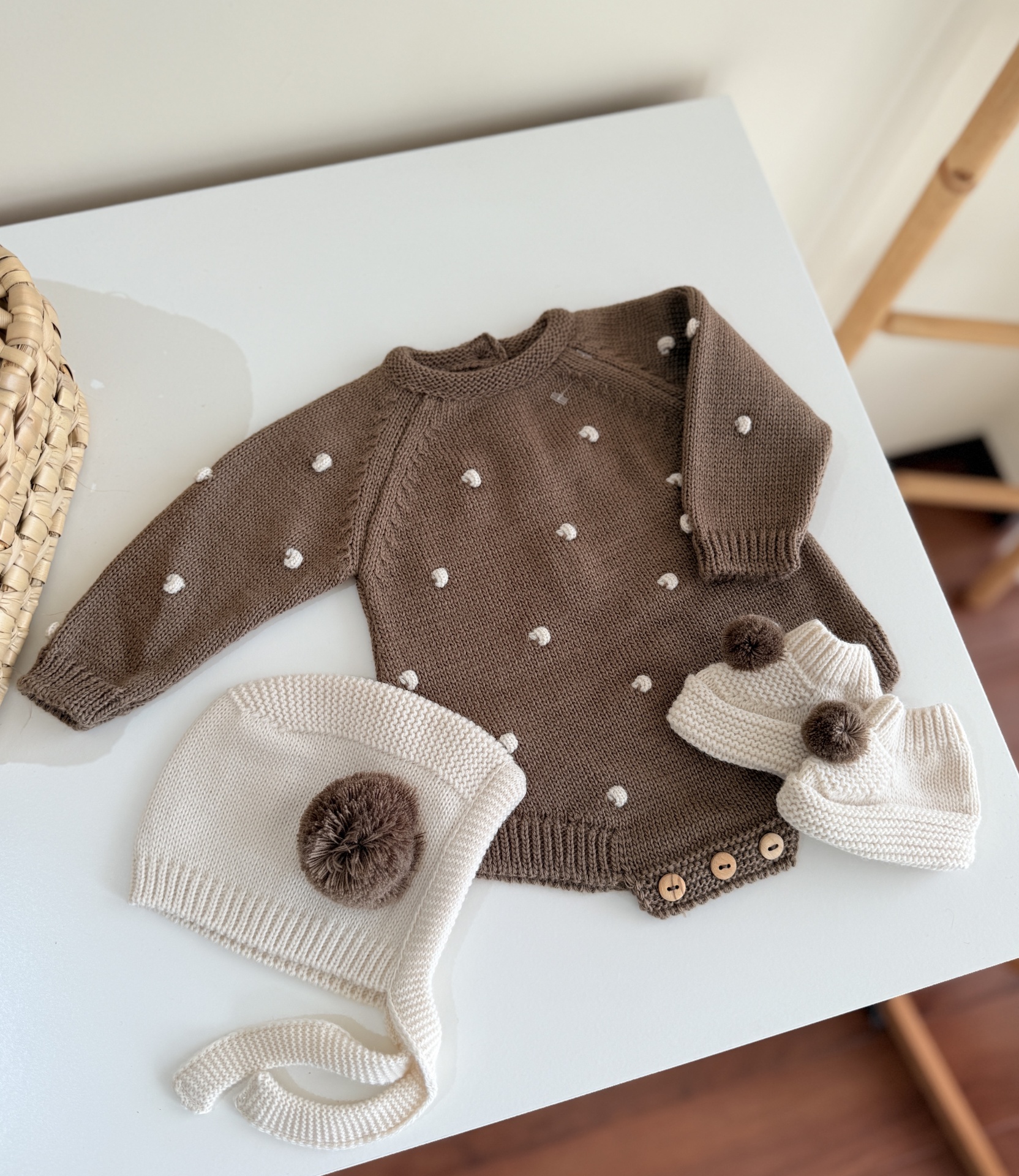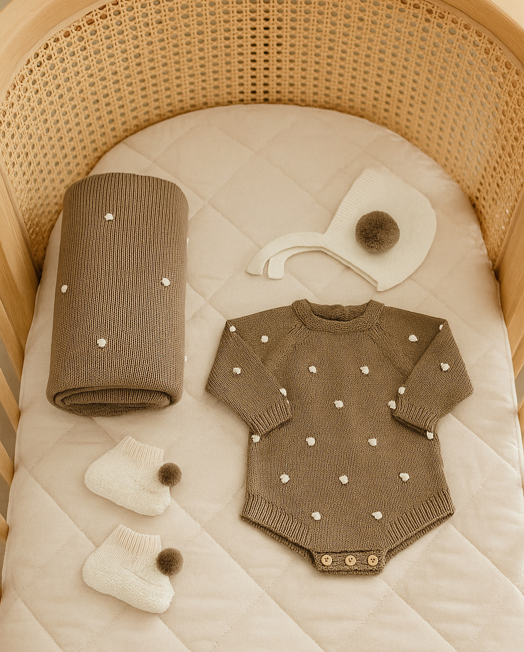 Conjunto de Malha para Bebé – Fofo + Touca + Carapins