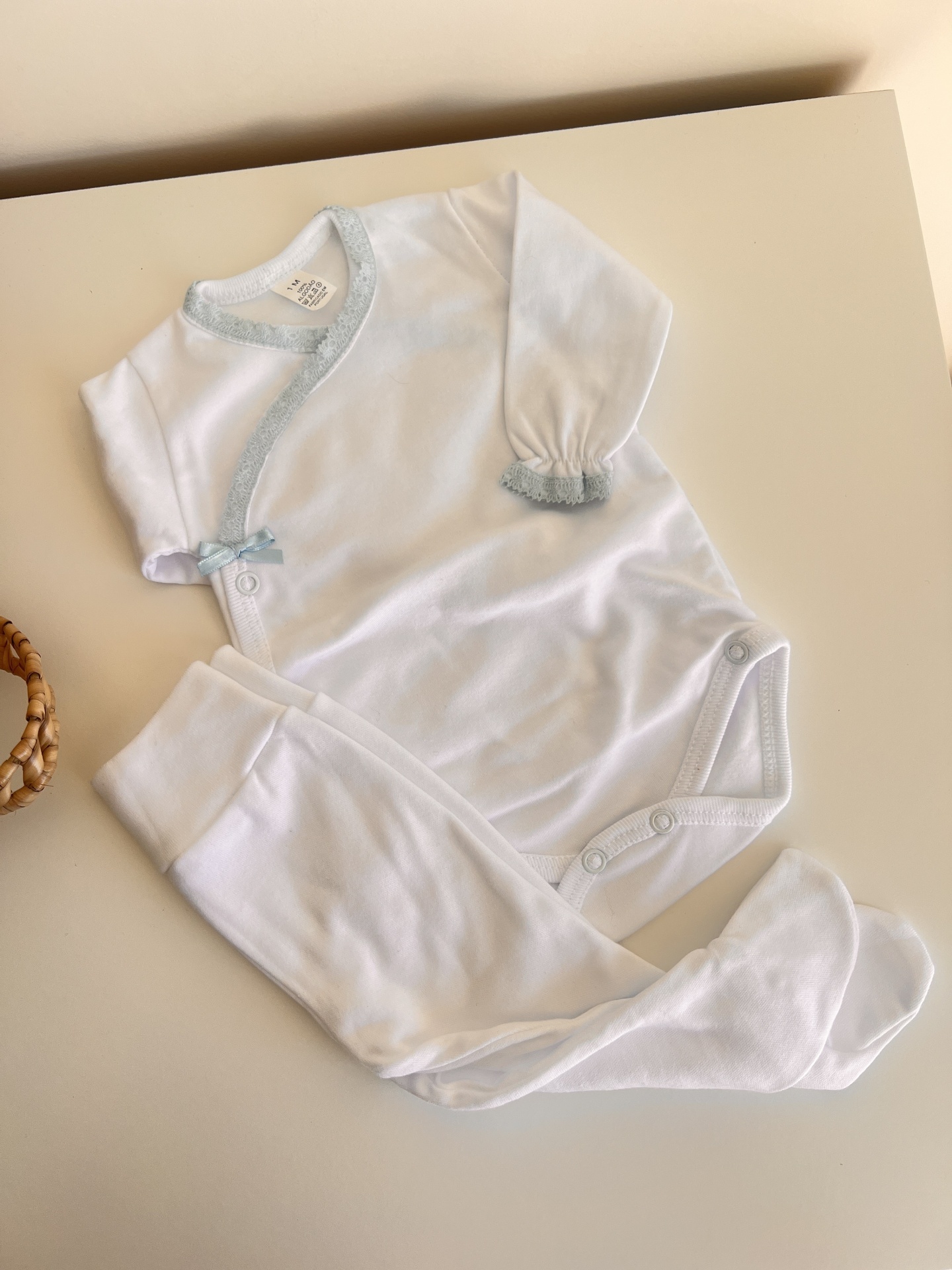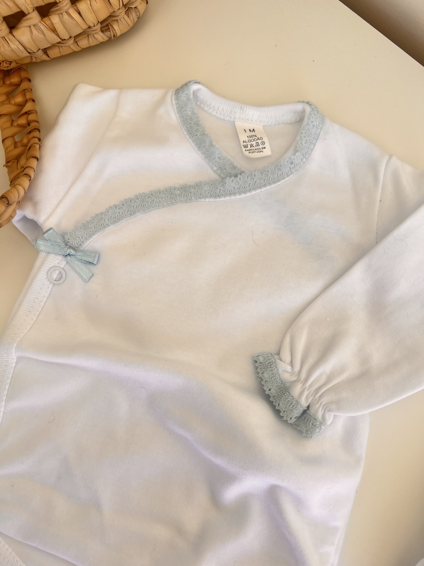 • Roupa de bebé branca e azul claro com body e calças em cima de uma mesa branca