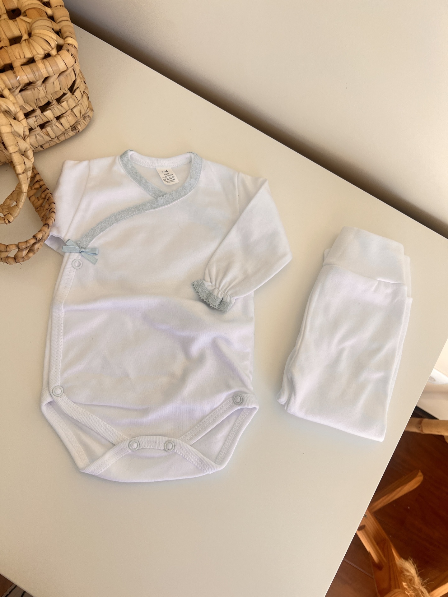 Roupa de bebé branca e azul claro com body e calças em cima de uma mesa branca