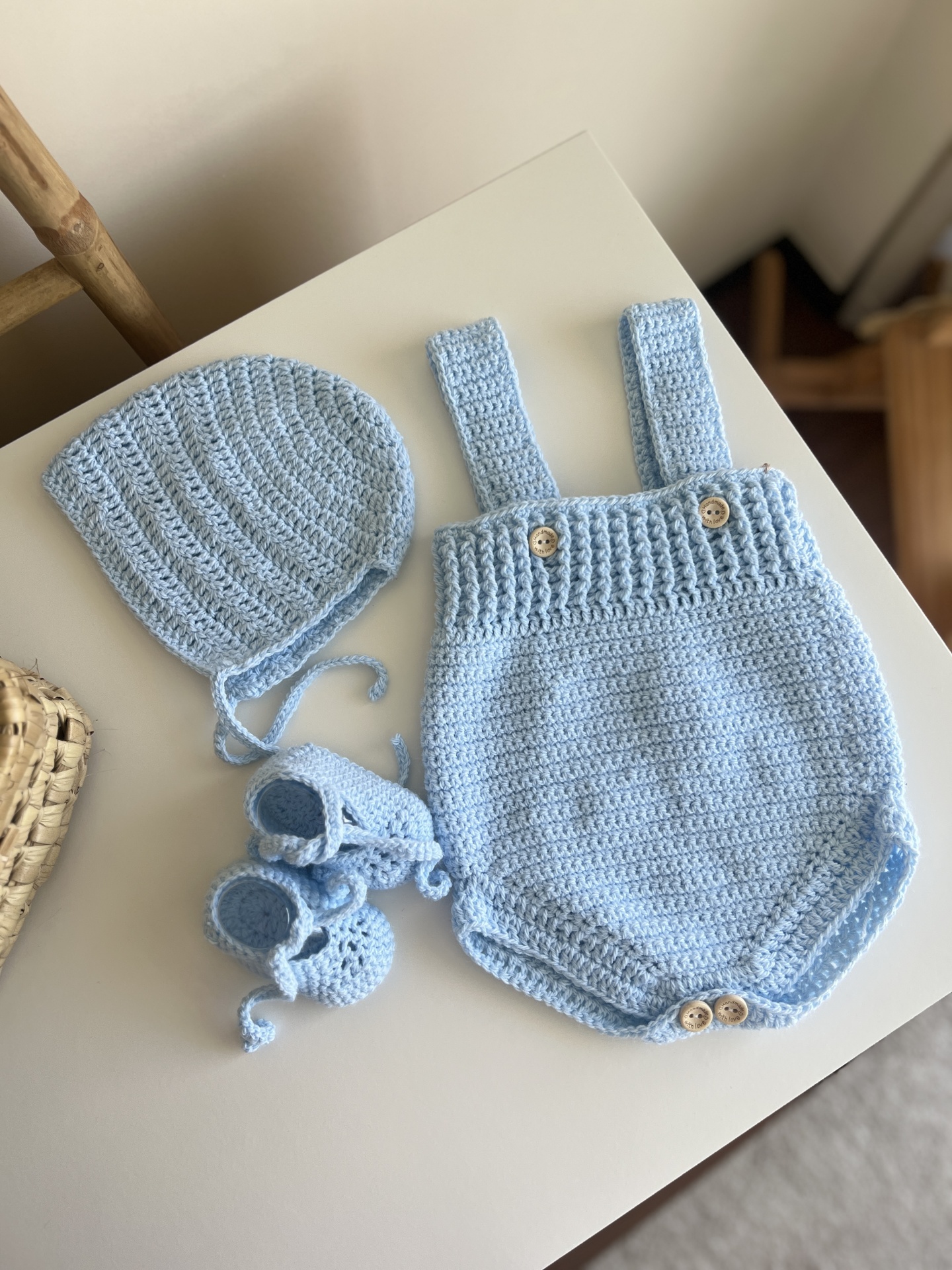 • Macacão bebé azul claro croché com botões de madeira sobre superfície branca