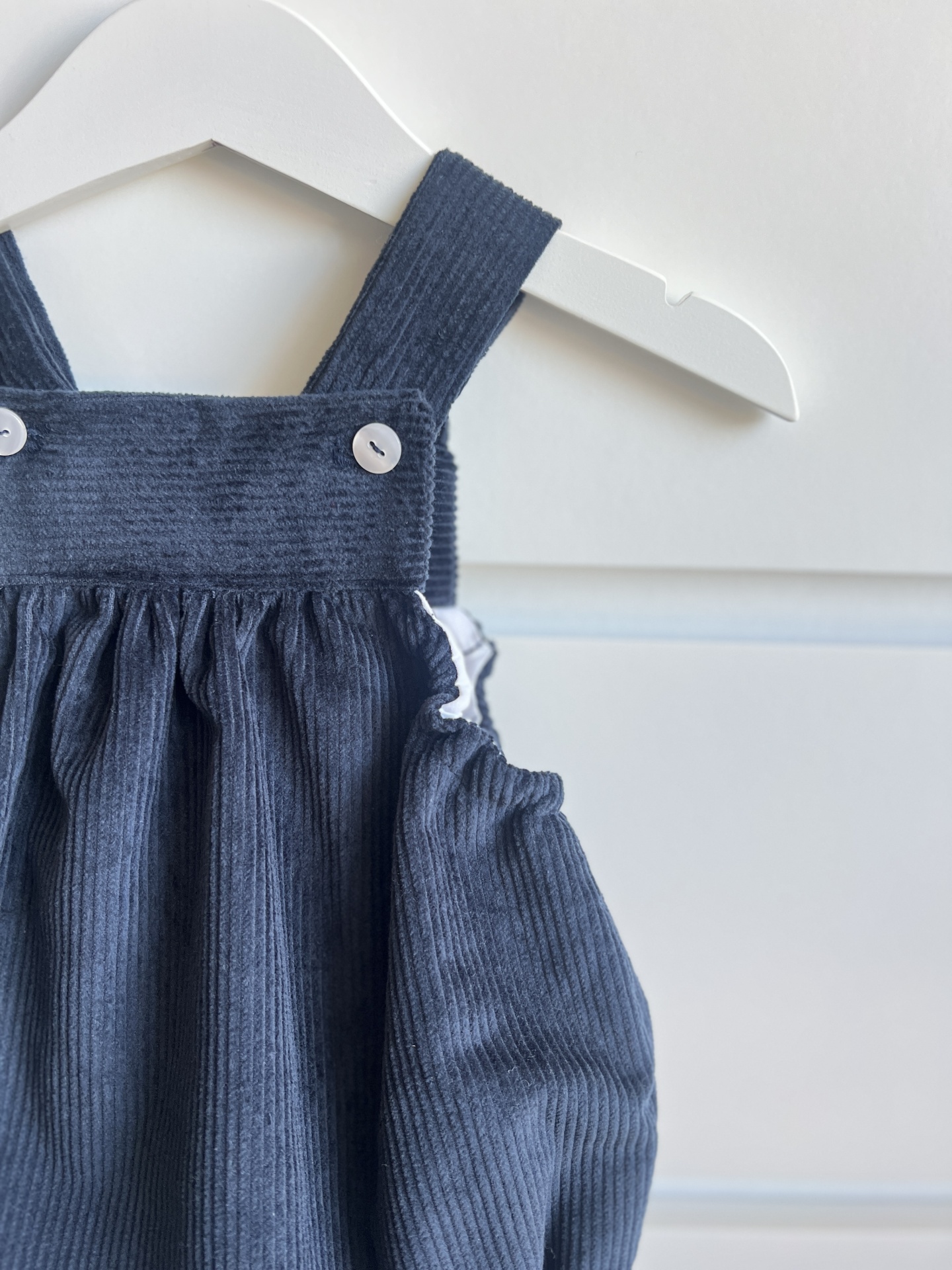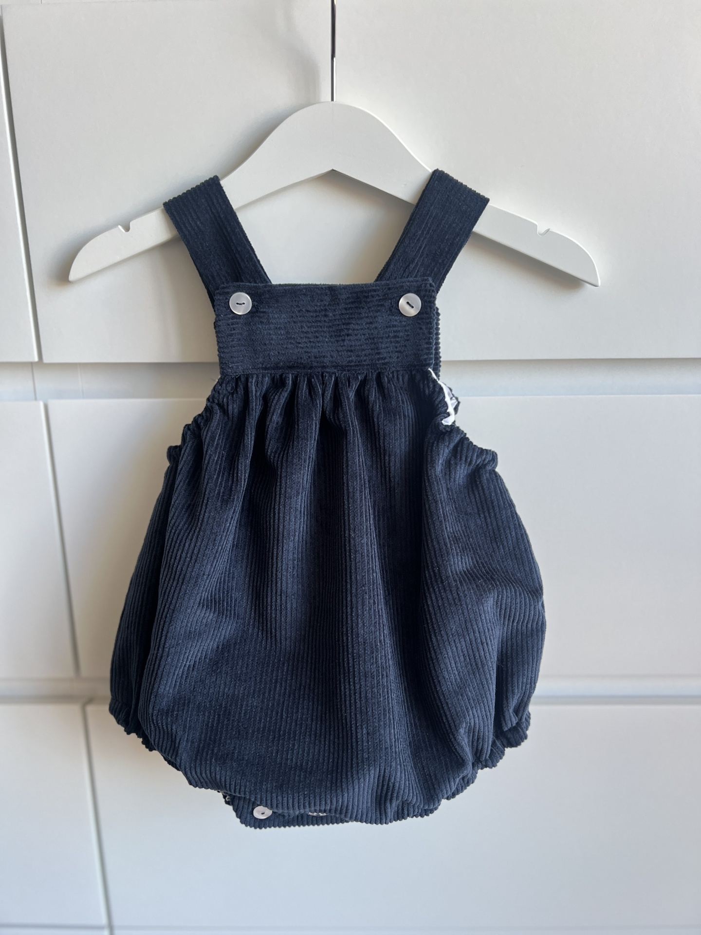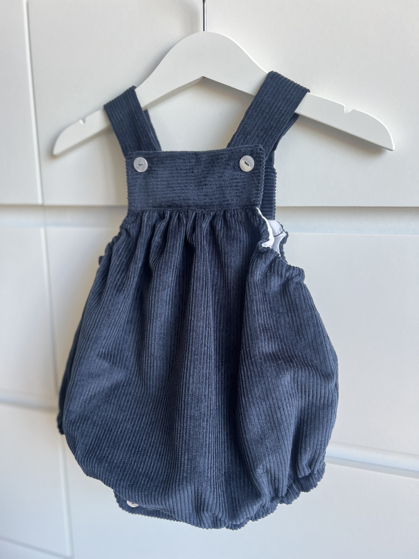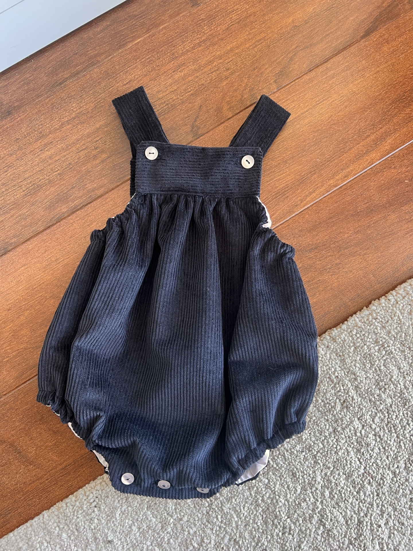 • Peto de bebé azul escuro de veludo cotelê com botões branco sobre madeira e tapete.
