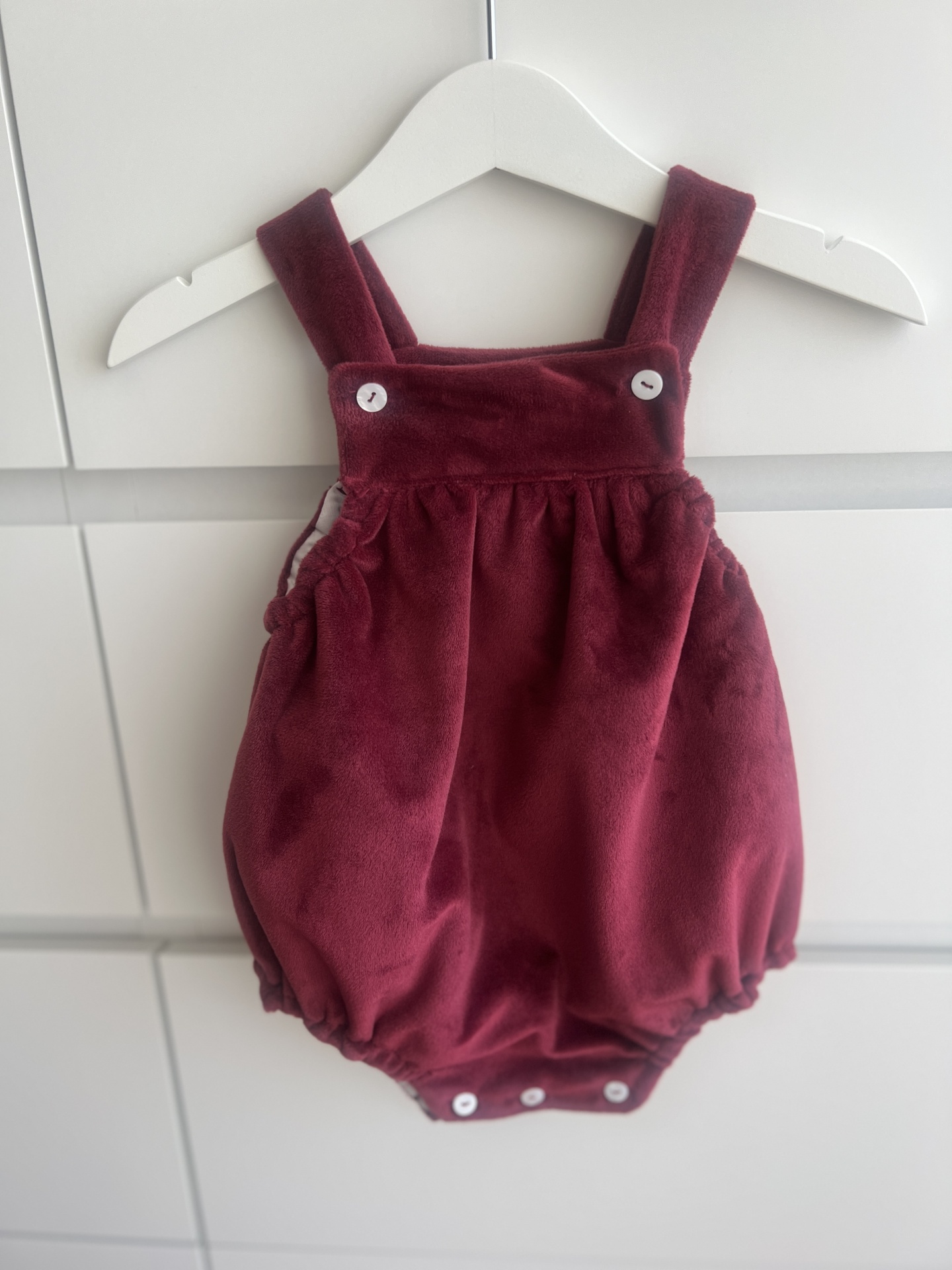 Macacão de bebé vermelho escuro em veludo com botões brancos