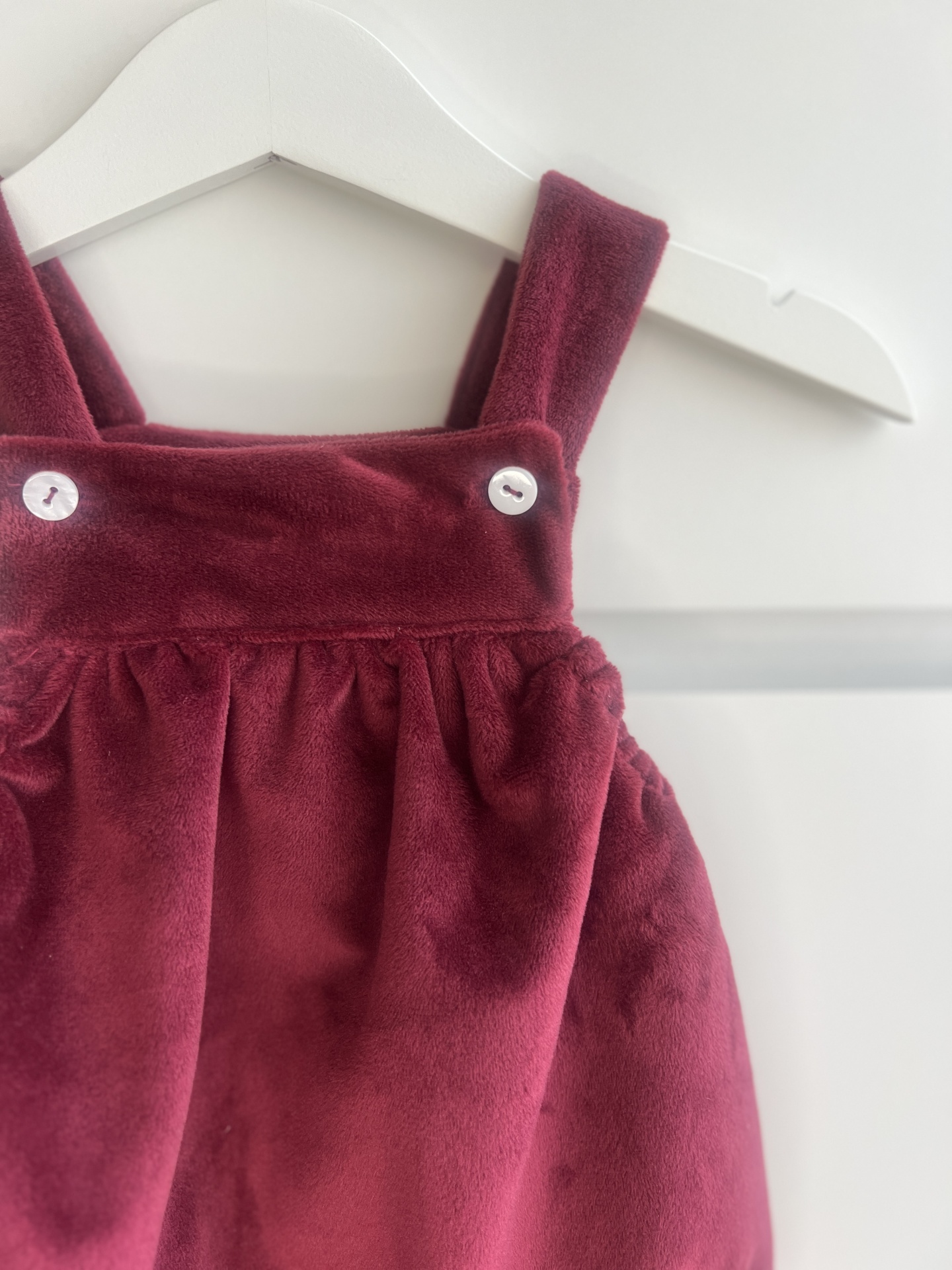 • Vestido de veludo bordô para criança com botões brancos, pendurado em cabide branco.