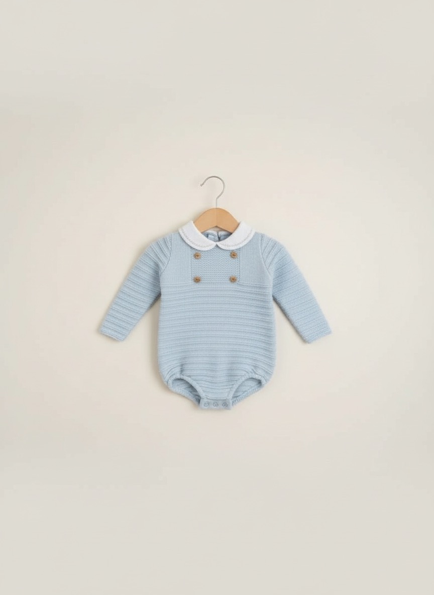 • Body de bebé azul claro com gola branca e botões, pendurado num cabide