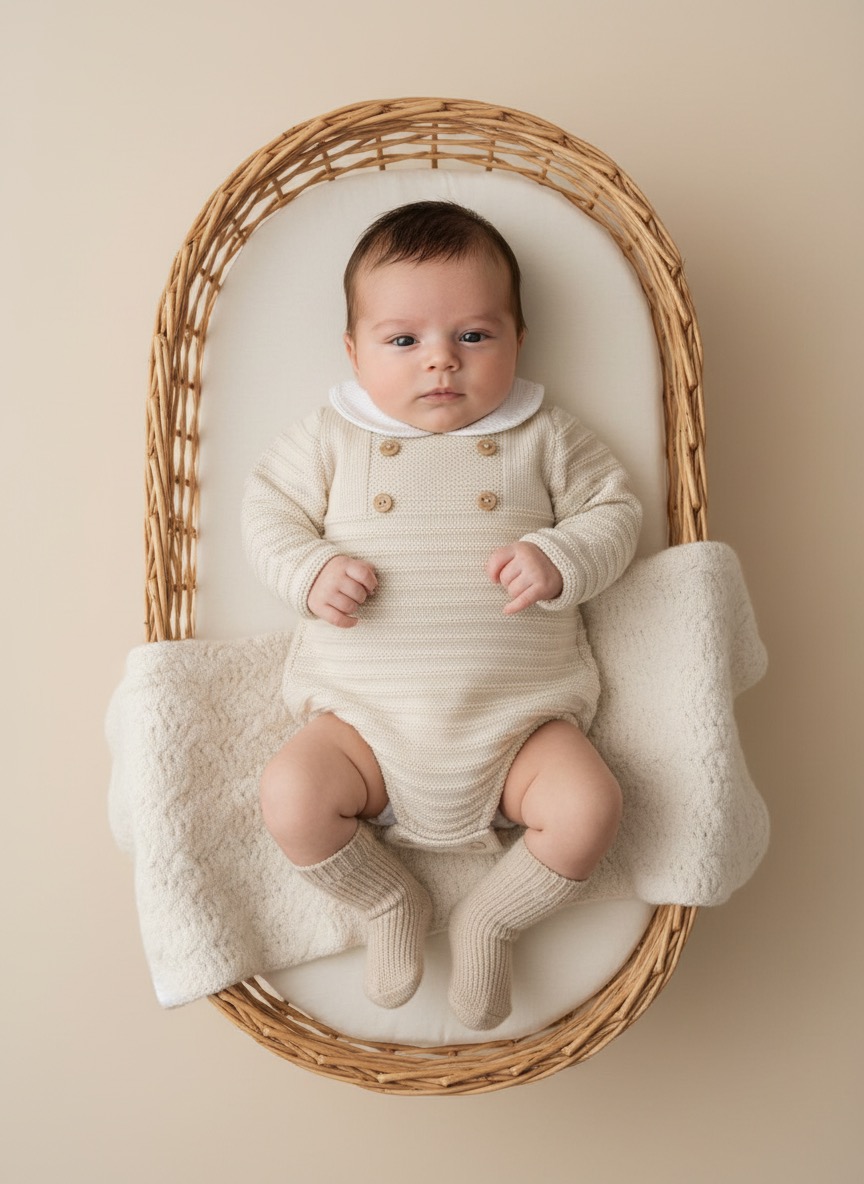 • Bebé deitado numa cesta de verga com roupa de malha creme