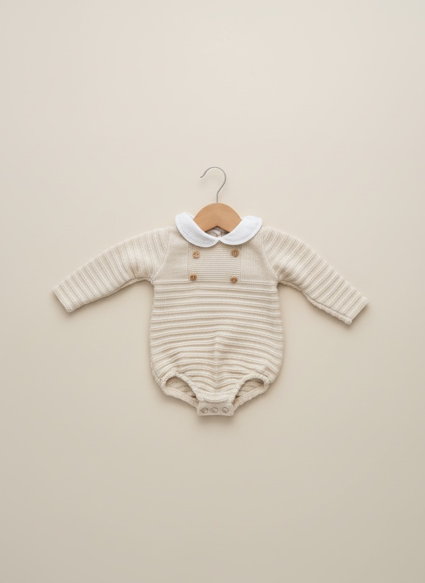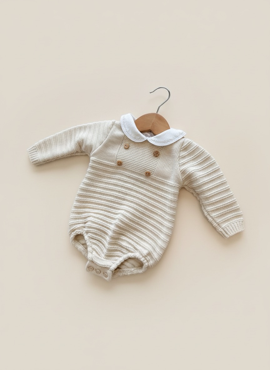 • Babygrow de malha bege com gola branca, botões de madeira e cabide de madeira