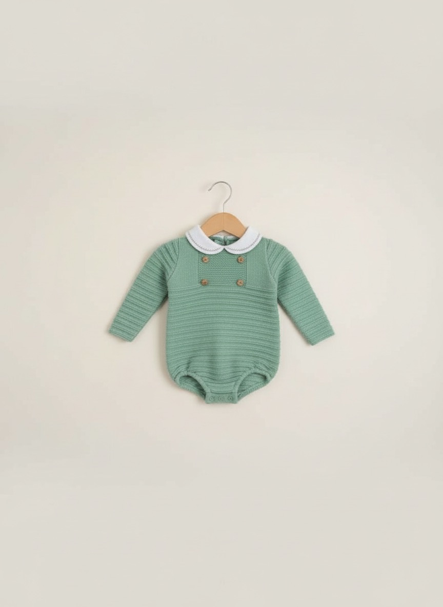 • Body de bebé verde com gola branca pendurado