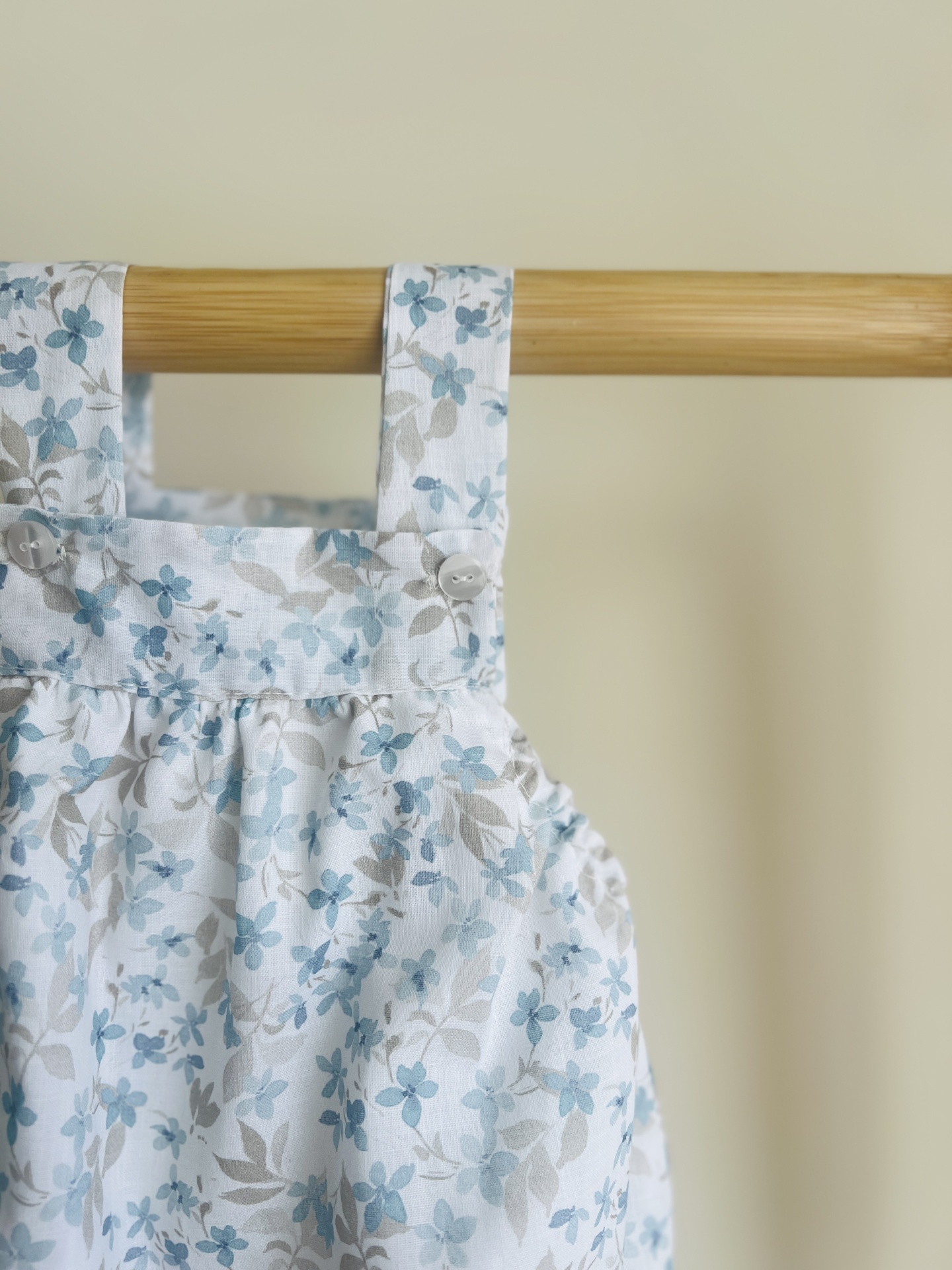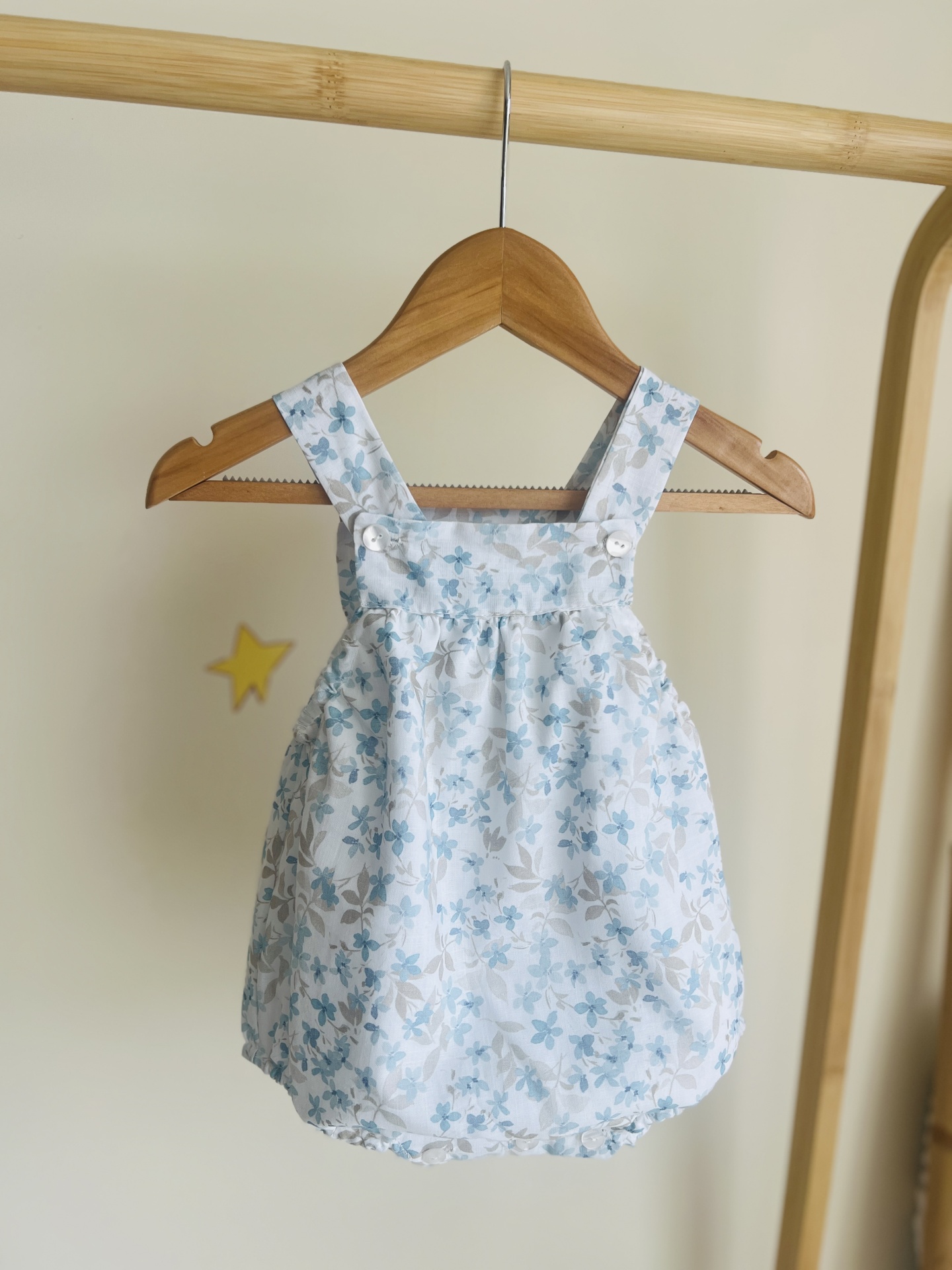• Macacão branco com flores azuis e bege pendurado num cabide de madeira