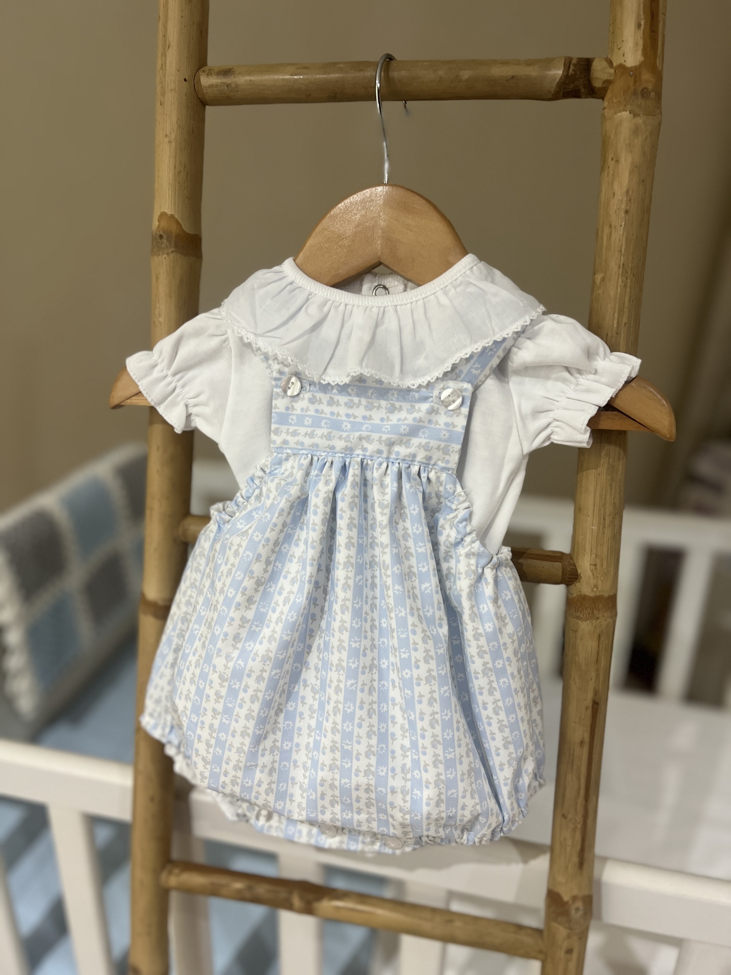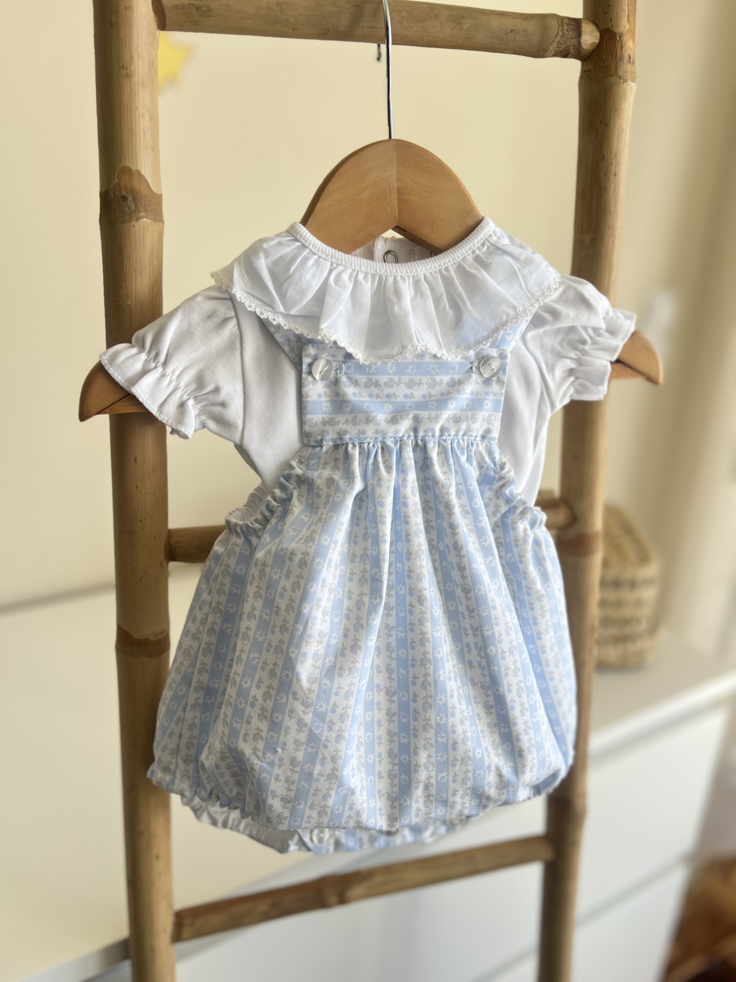 • Macacão de bebé azul com padrão floral branco e camisa branca com gola babado num cabide de madeira