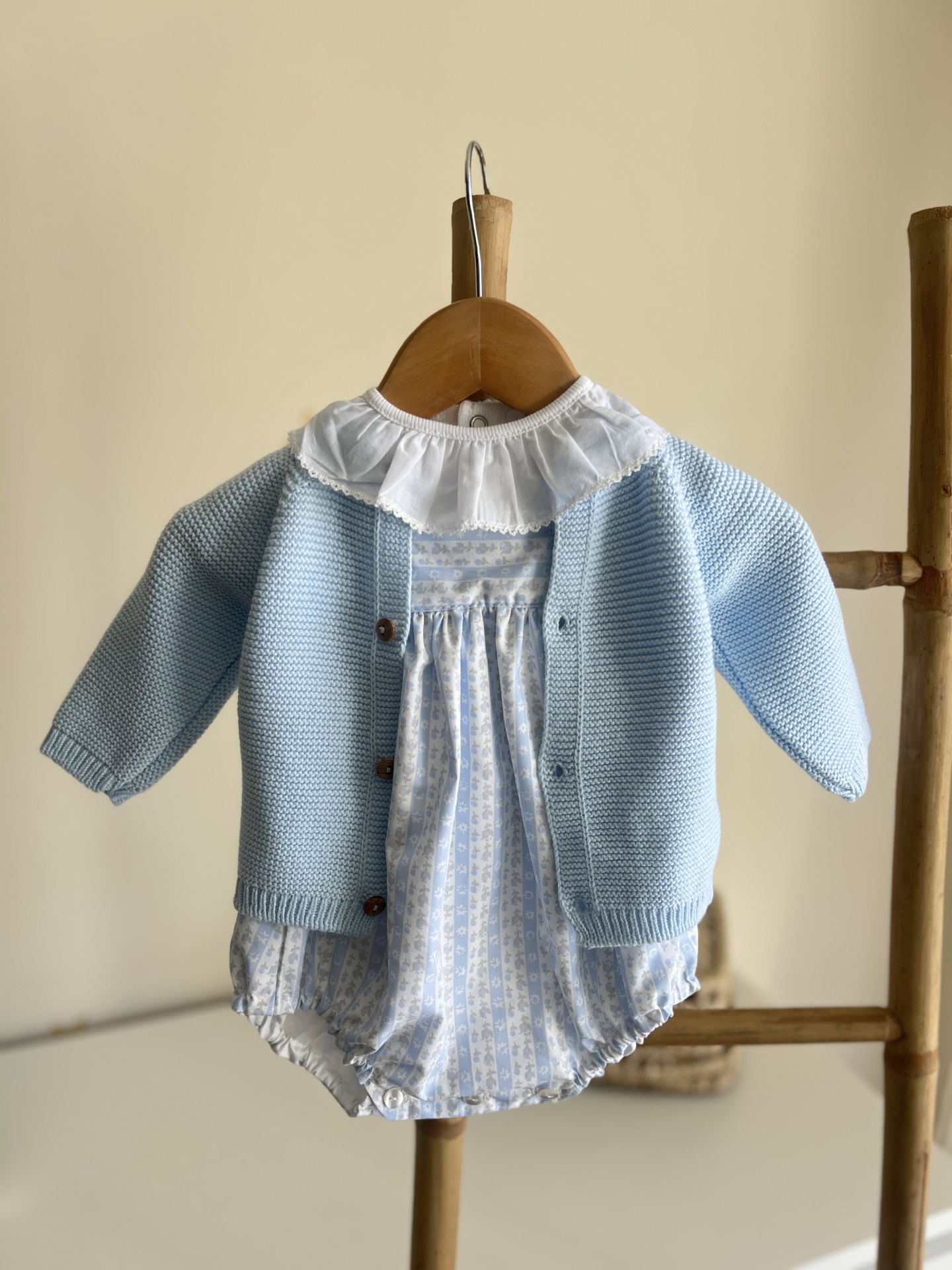 • Roupa de bebé azul claro com casaquinho de malha e macacão floral branco e azul pendurado em cabide de madeira
