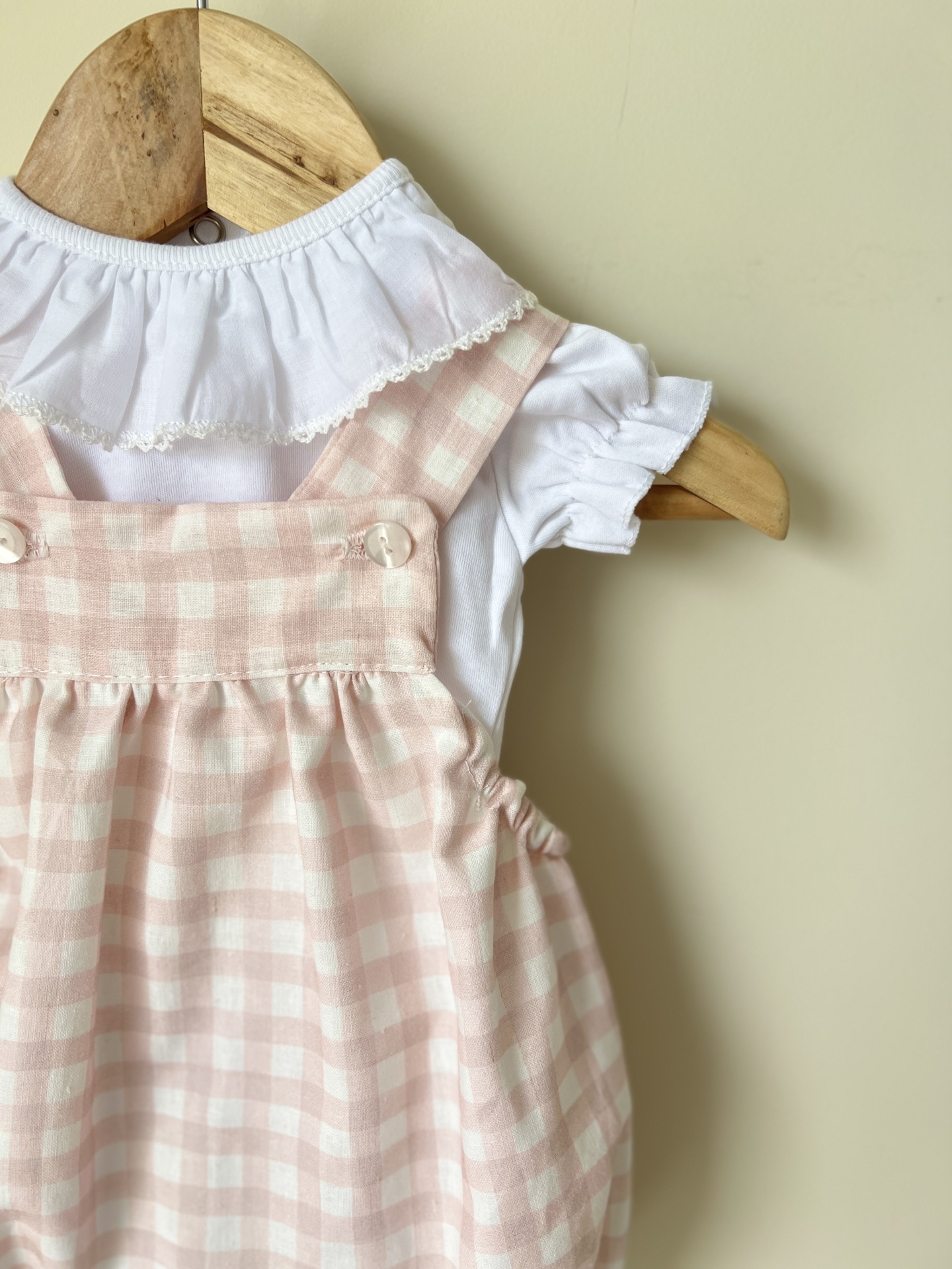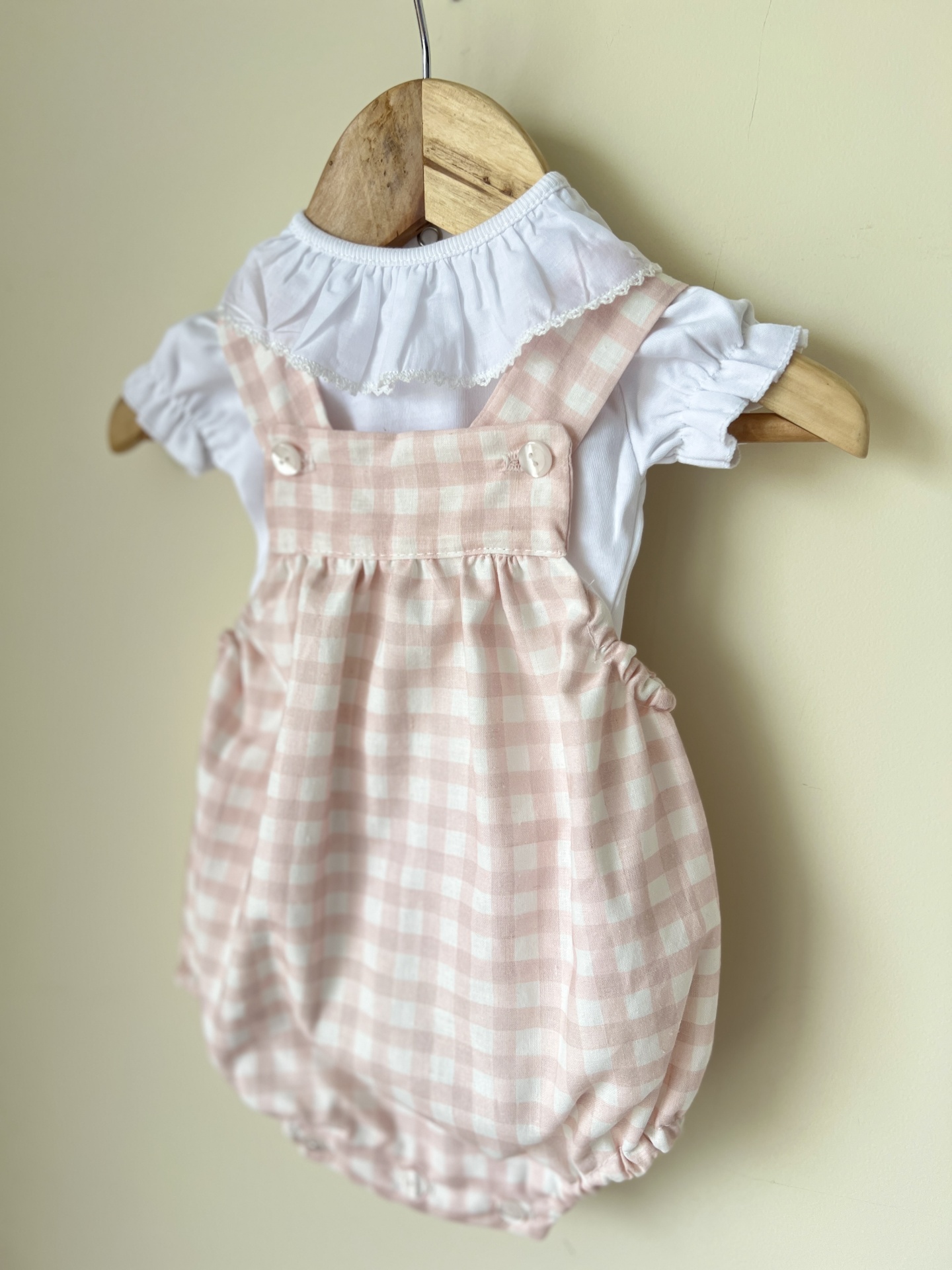 Macacão bebé xadrez rosa e branco com camiseta branca pendurado
