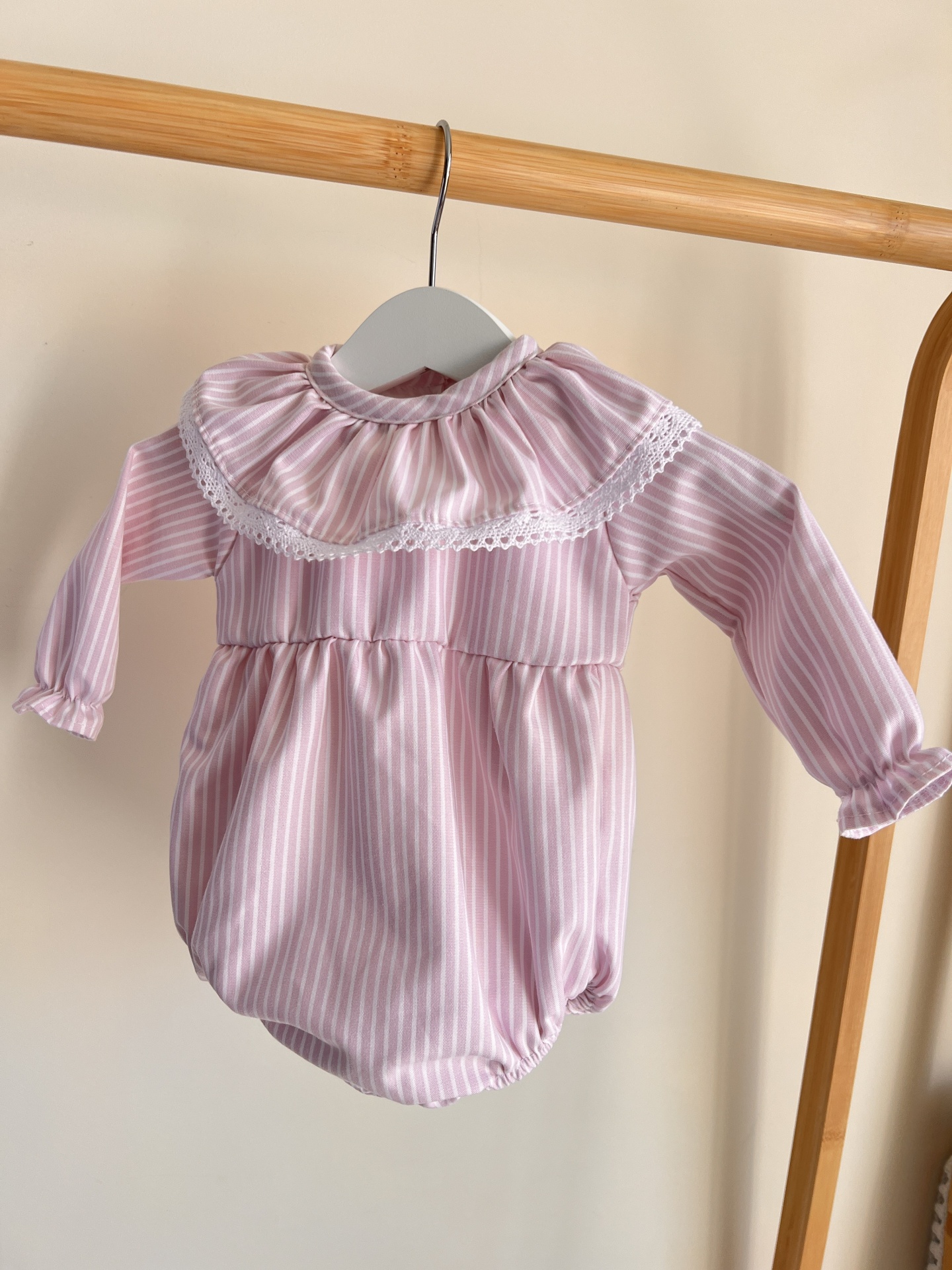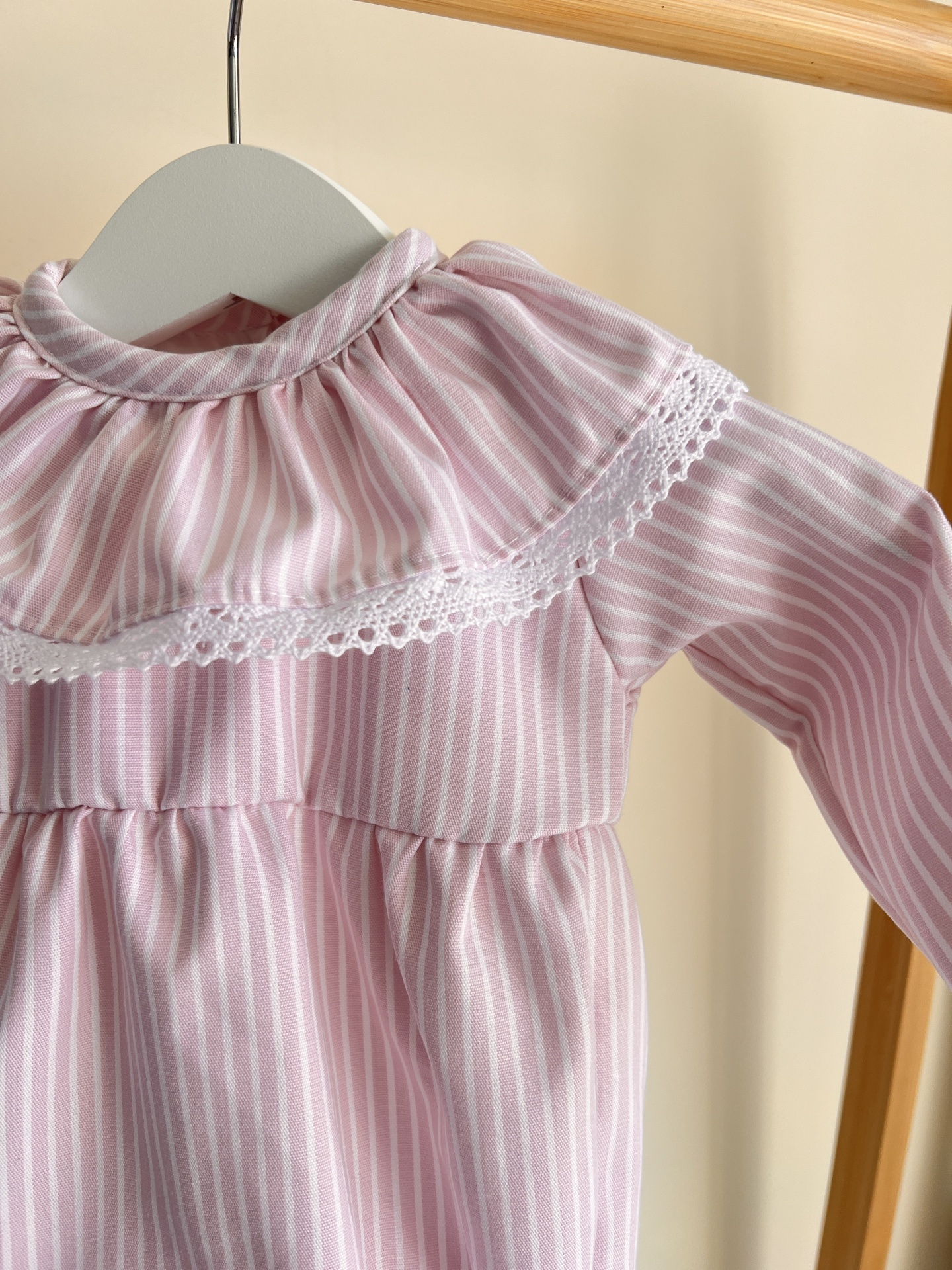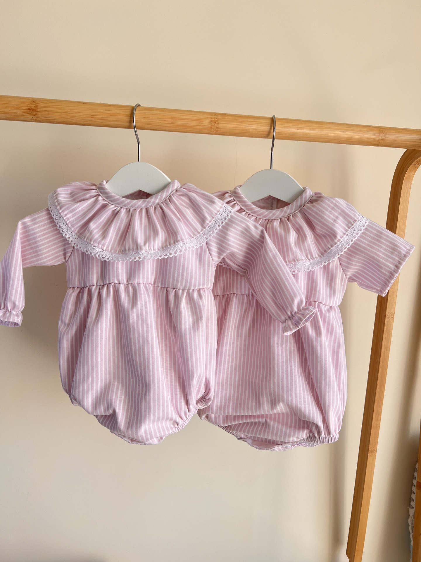 • Dois macacões cor-de-rosa com riscas brancas para bebé, um de manga comprida e outro de manga curta, com gola franzida e renda, pendurados em varão de madeira