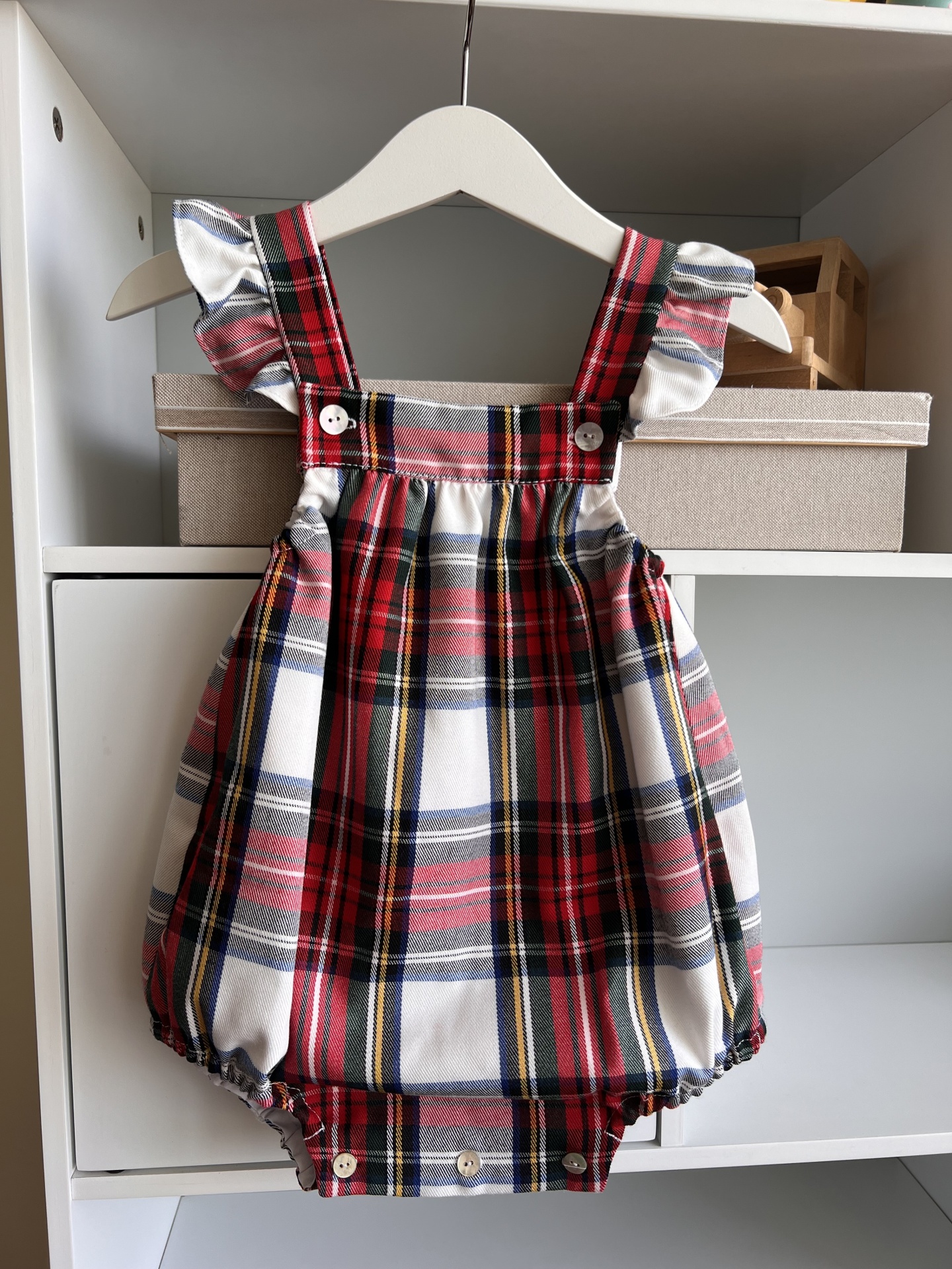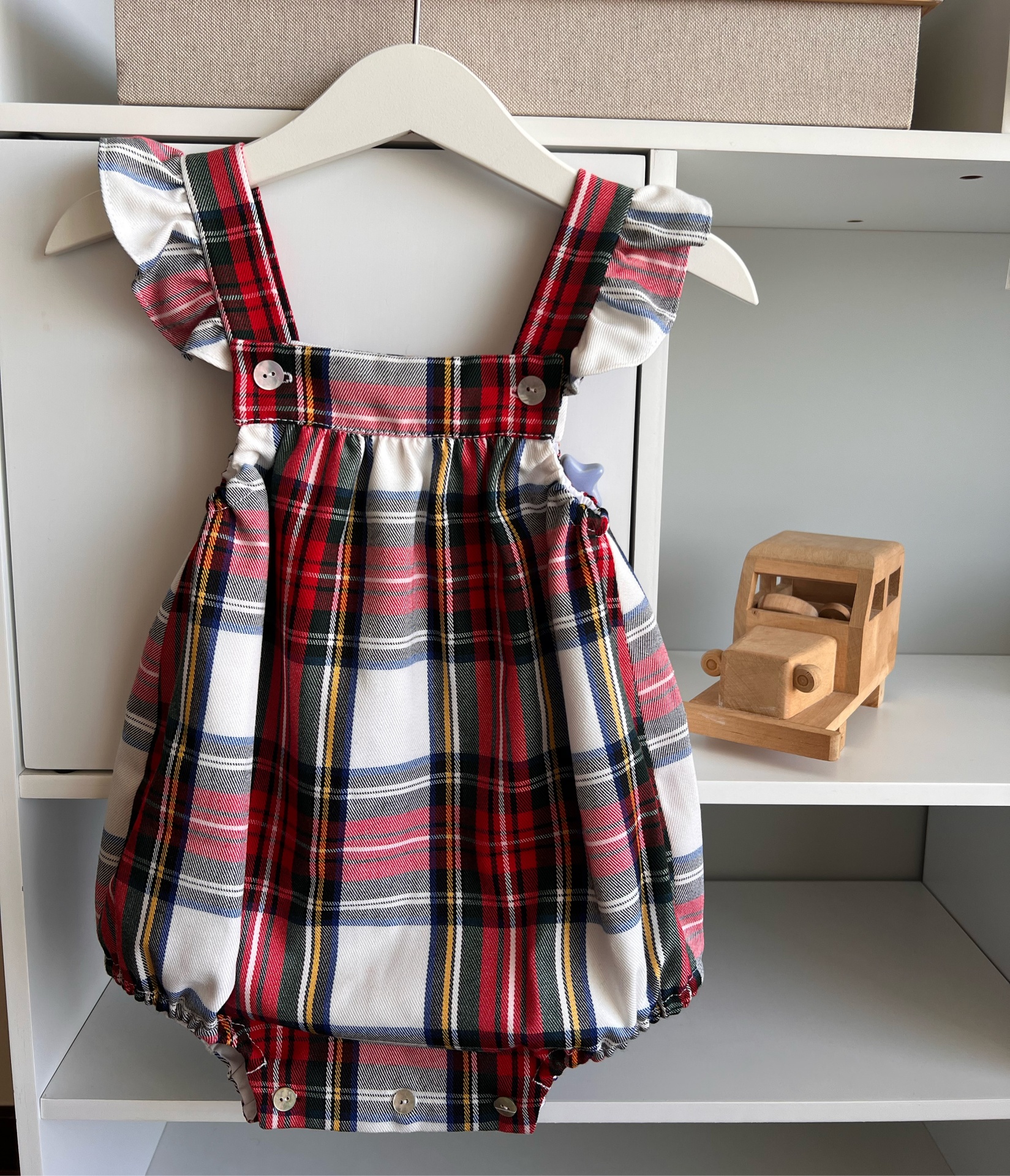 • Macacão de bebé xadrez com folhos e botões pendurado num cabide numa estante branca