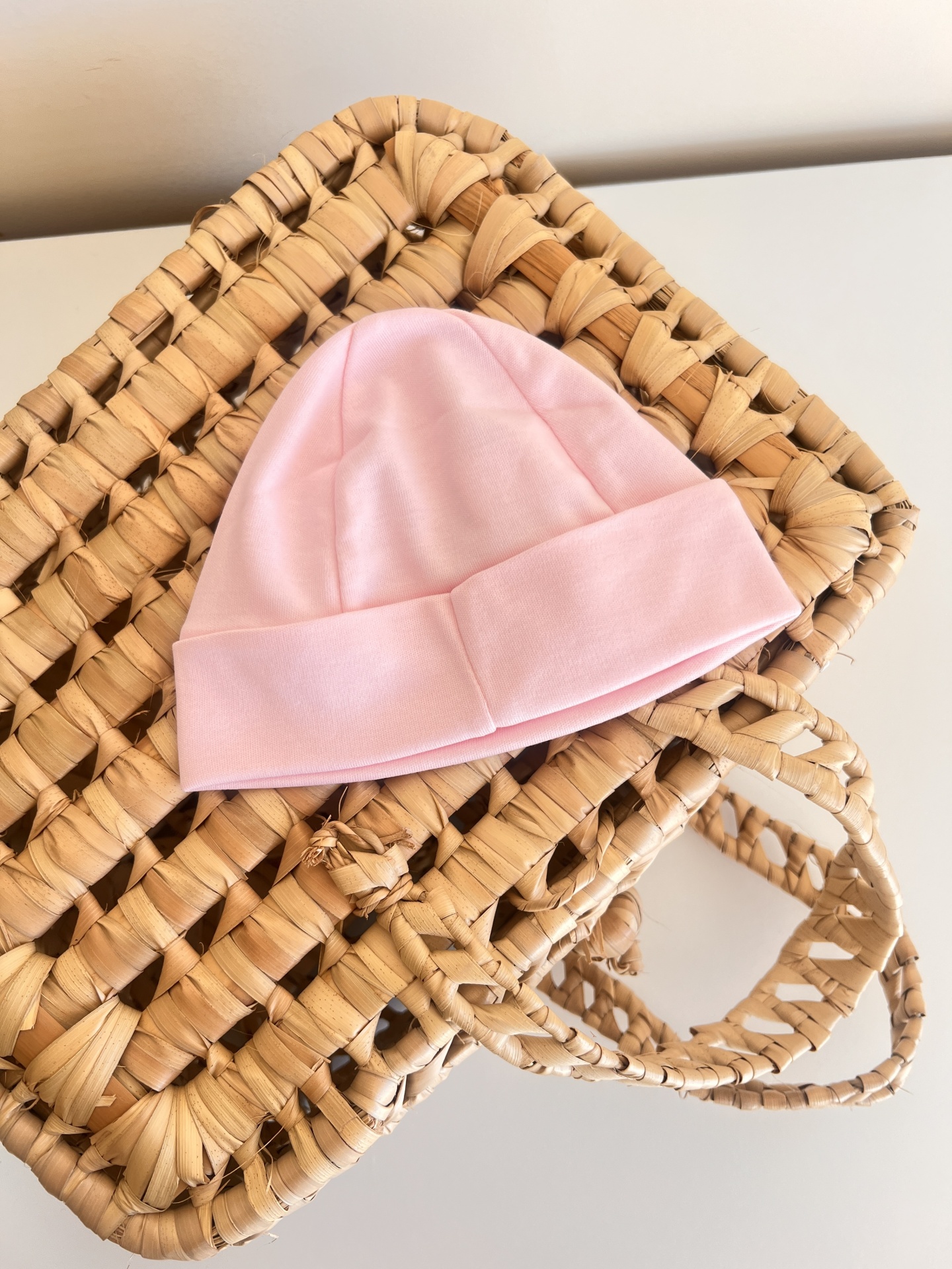 • Gorro de bebé cor-de-rosa claro sobre mala trançada natural