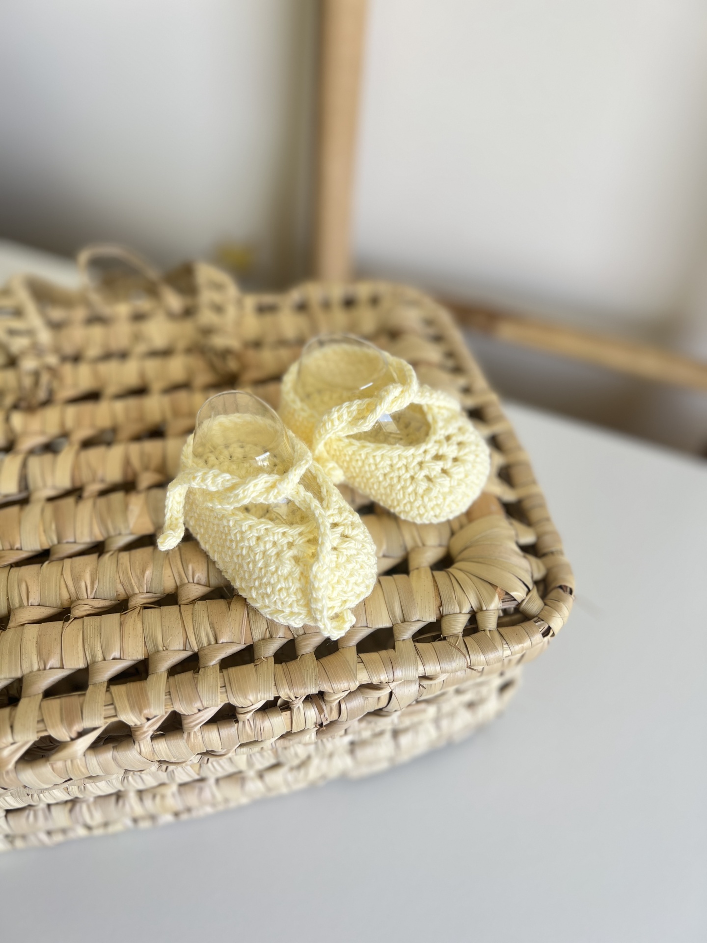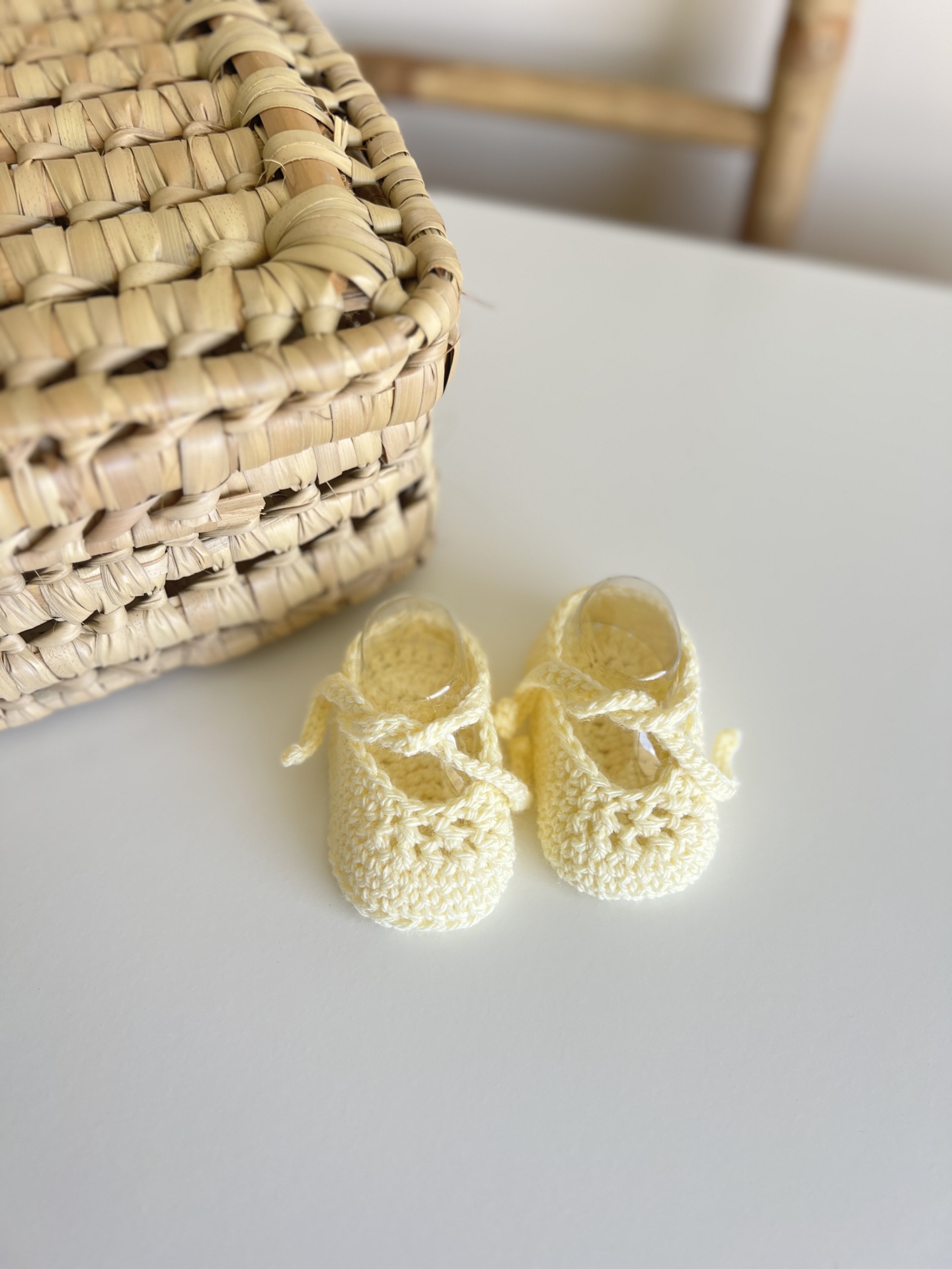 • Sapatos de bebé em crochê amarelos ao lado de uma cesta de verga