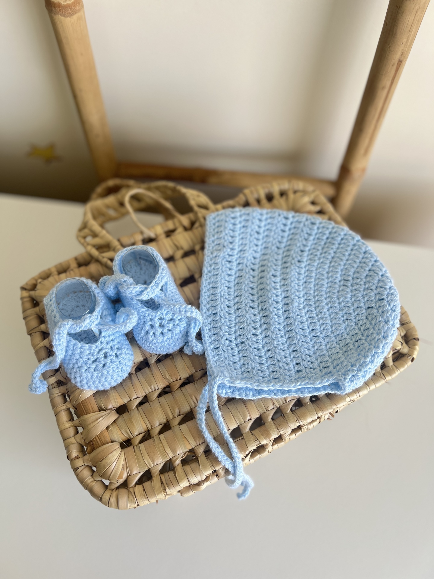 • Conjunto de chapéu e sapatinhos de bebé em crochet azul claro sobre cadeira de madeira com assento em palha trançada